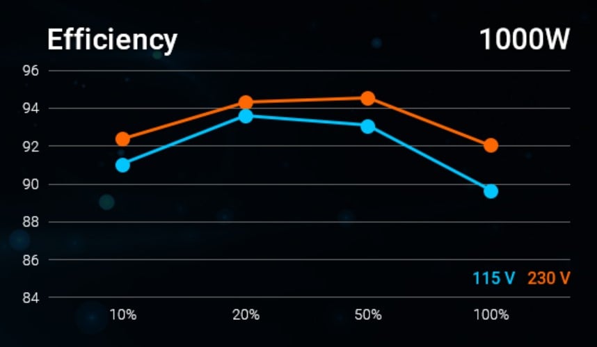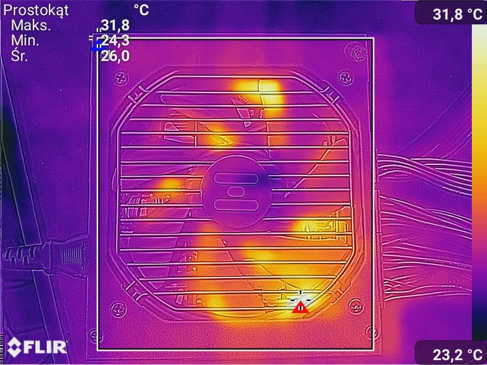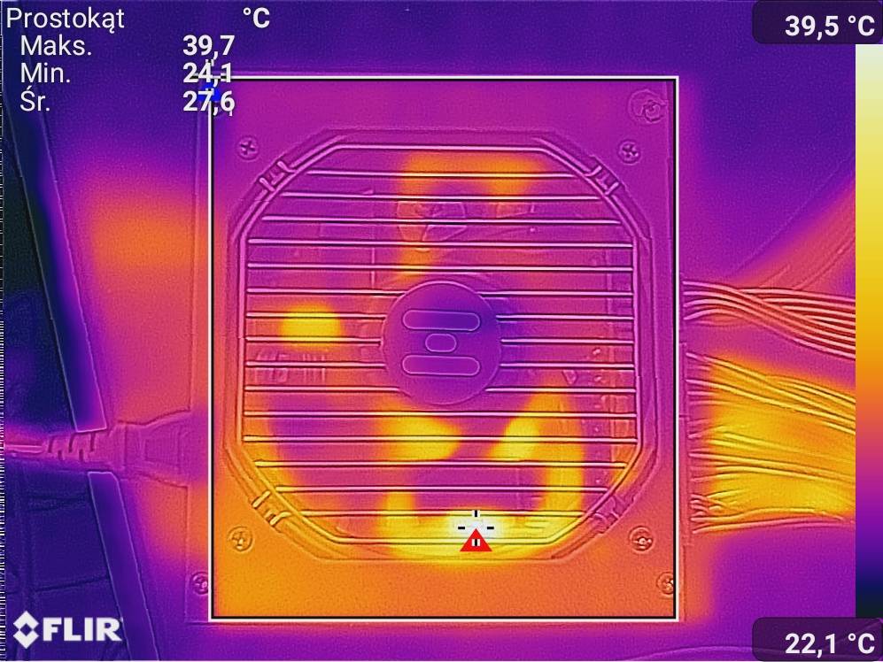 Napięcia są bliskie idealnych wartości. Nie ma też dużych spadków pod obciążeniem, więc pod tym względem jest naprawdę bardzo dobrze. Spokojnie więc taki zasilacz poradzi sobie z niepodkręconym i9-14900K i RTX 4090. W spoczynku po włączeniu trybu Eco jest idealna cisza – wentylator nie działa. Pod obciążeniem nadal jest cicho i z pewnością zasilacz nie będzie przeszkadzał podczas pracy. Temperatury również są dobre i też nie ma co im zarzucić.