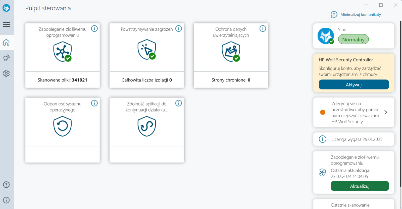 HP EliteBook 1040 G10 otrzymujemy wraz z systemem Windows 11 Pro na pokładzie. Ale to nie wszystko – dodatkowo trzymujemy HP Wolf Pro Security Edition z roczną licencją. Czym jest ten „wilk”? Mamy tu solidny, przeznaczony do zastosowań biznesowych program zabezpieczający system oraz sprzęt na wielu poziomach – zaczynając od blokowania złośliwego oprogramowania z sieci, kończąc na skanowaniu plików zapisanych na twardym dysku. Mówiąc inaczej – antywirus nie powinien być potrzebny. Niestety, o skuteczności nic powiedzieć nie mogę, ponieważ po prostu na żadne szkodniki świadomie nie trafiłem, aczkolwiek w panelu pojawiła się informacja o zablokowaniu złośliwego oprogramowania z sieci, a więc Wolf zadziałał w tle.
