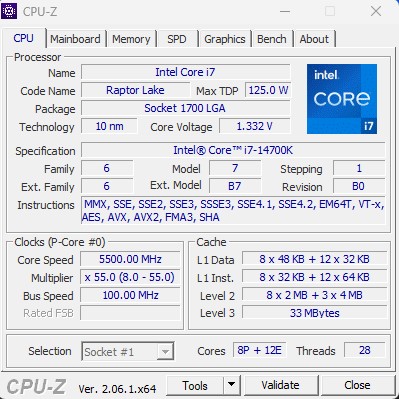 Procesor ma 8 rdzeni P oraz 12 rdzeni E. Mamy więc o 4 rdzenie E więcej niż w przypadku i7-13700K i o 4 mniej niż w przypadku i9-14900K. Wielowątkowość oferują tylko rdzenie P, więc łącznie jest 28 wątków. Maksymalne taktowanie rdzeni P wynosi 5,6 GHz (Turbo Boost Max Technology 3.0), a przy obciążeniu wszystkich rdzeni 5,5 GHz. W przypadku rdzeni E maksymalne taktowanie wynosi 4,3 GHz. Bazowe taktowania wynoszą 3,4 GHz (P) i 2,5 GHz (E). Tutaj widać również wzrost względem poprzednika, choć nie jest on wyjątkowo spory. Musicie też pamiętać, że Intel Core i7-14700K należy do rodziny Raptor Lake Refresh, czyli tylko odświeżonej edycji procesorów.