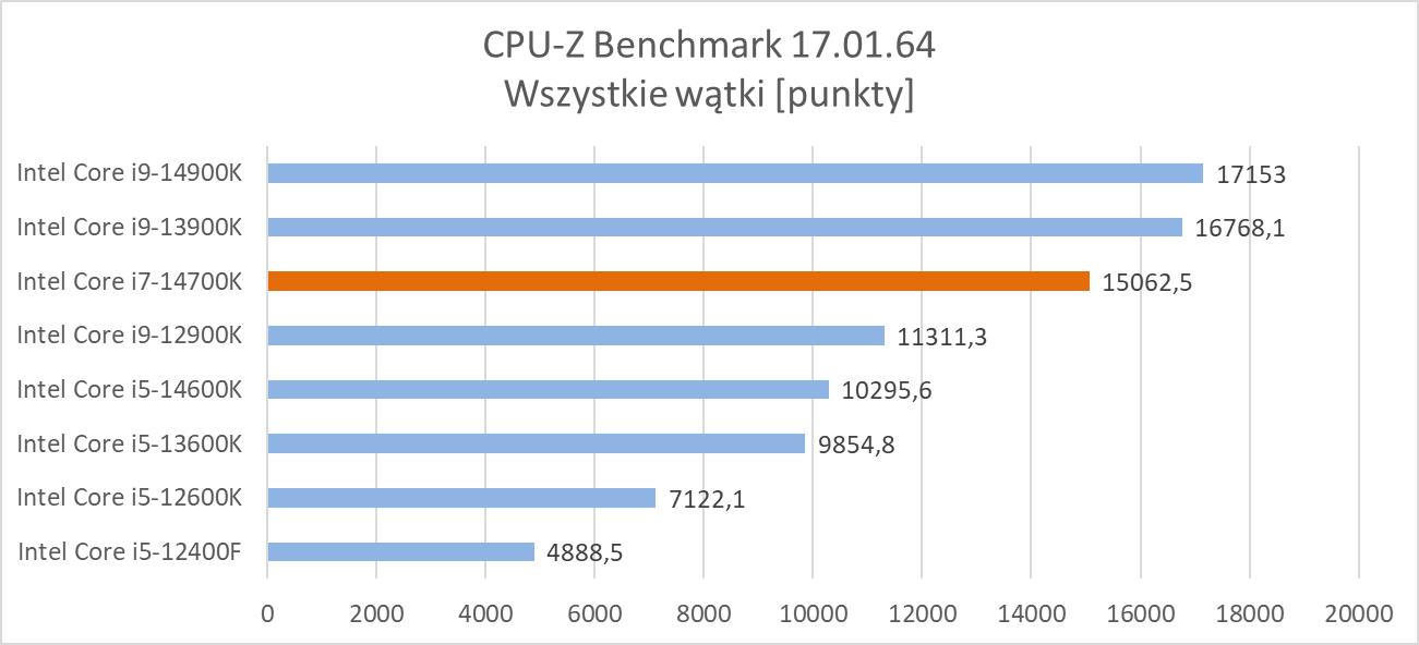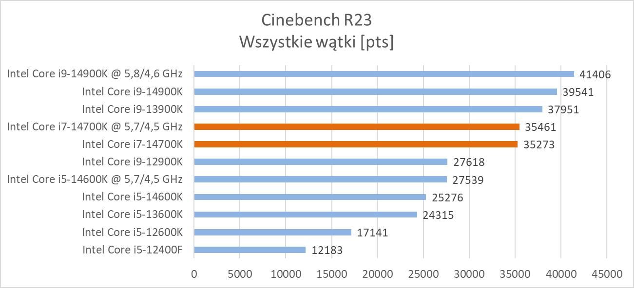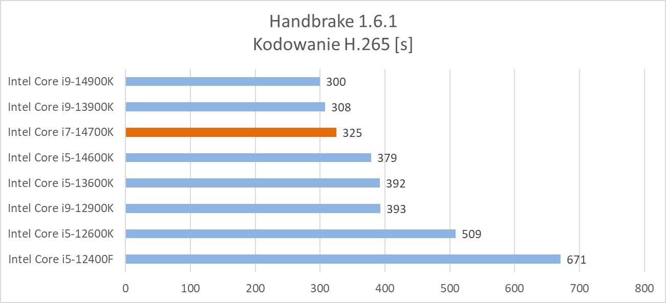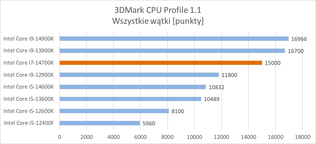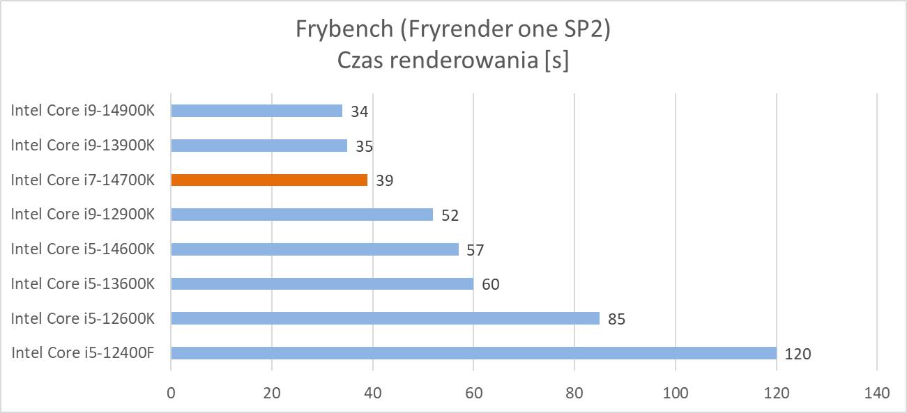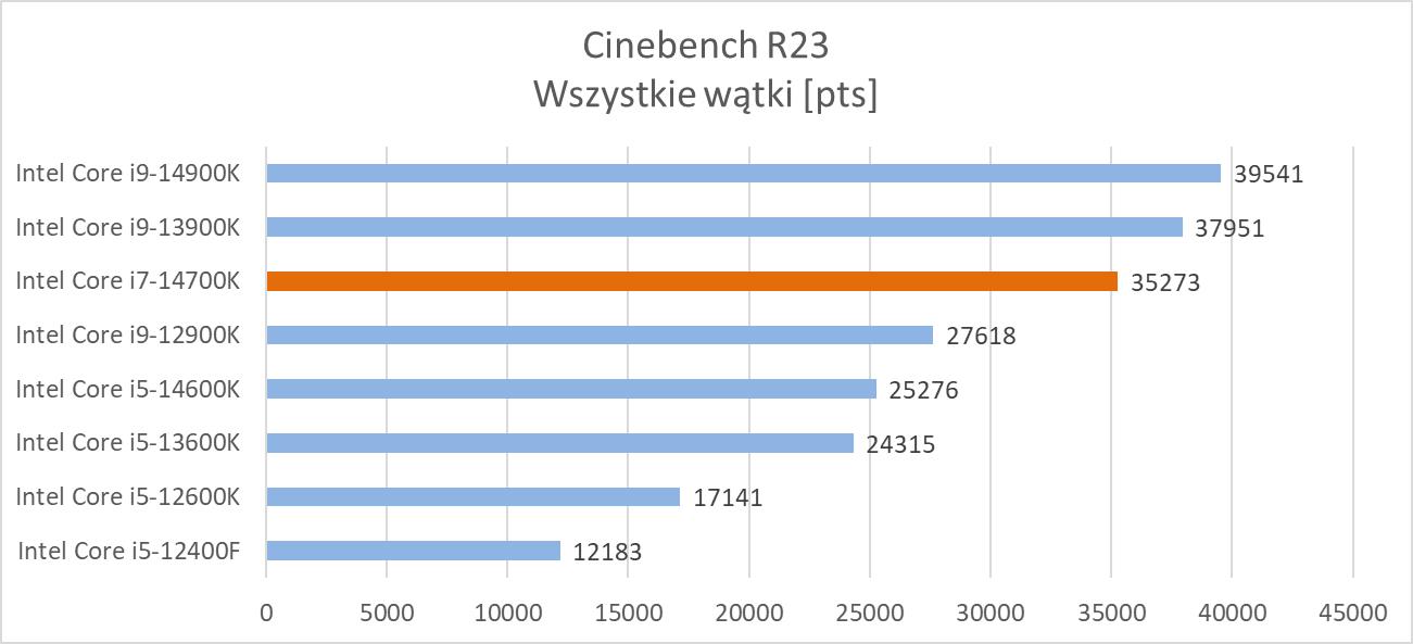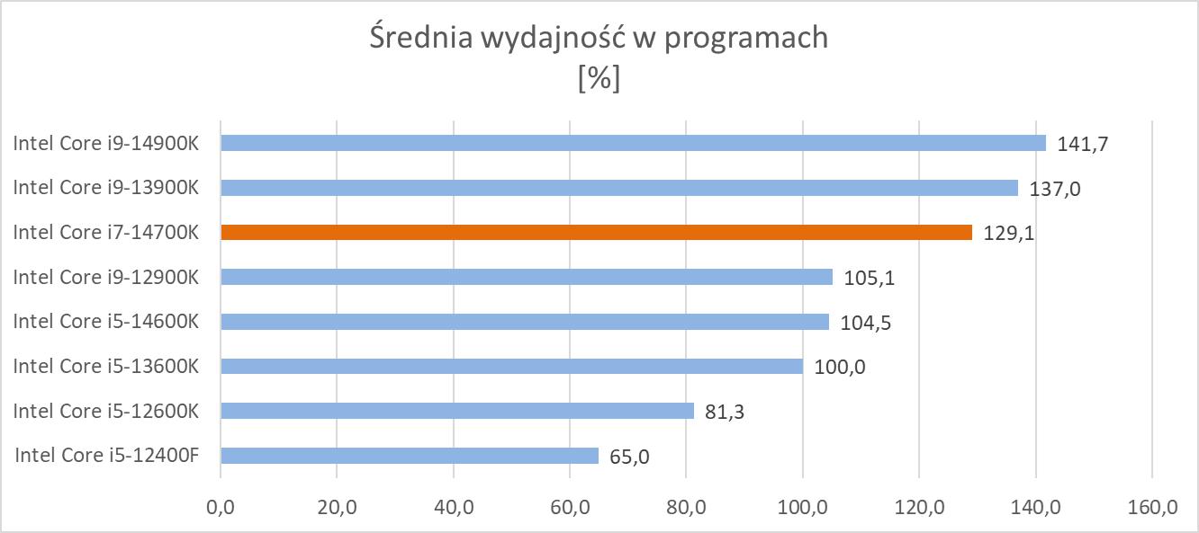 Procesor średnio wypada bardzo blisko i9-13900K. We wszystkich programach znajduje się on na 3 miejscu, zaraz za wspomnianym procesorem. Jest to bardzo dobry wynik, a samo CPU naprawdę bardzo dobrze sprawdzi się w różnych zastosowaniach profesjonalnych. Trzeba też pamiętać, że mamy o 4 rdzenie E więcej niż w przypadku i7-13700K. Sprawia to, że warto tutaj zamiast starszej jednostki jednak zdecydować się na zakup nowszej.