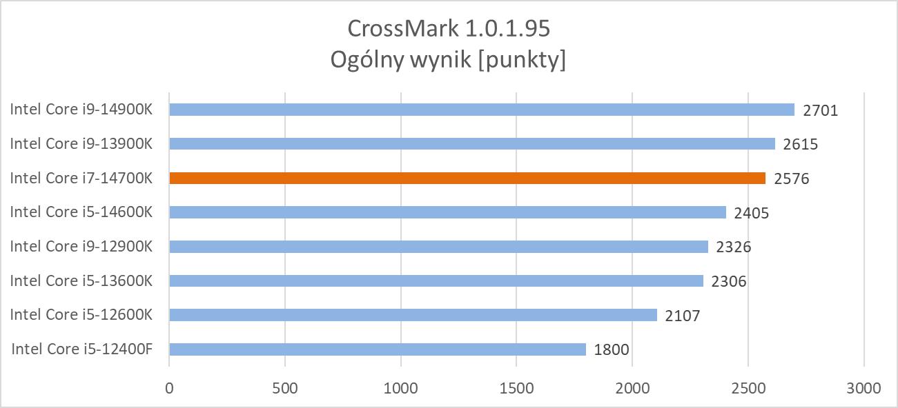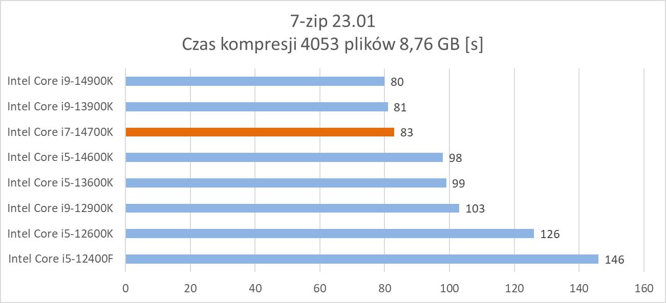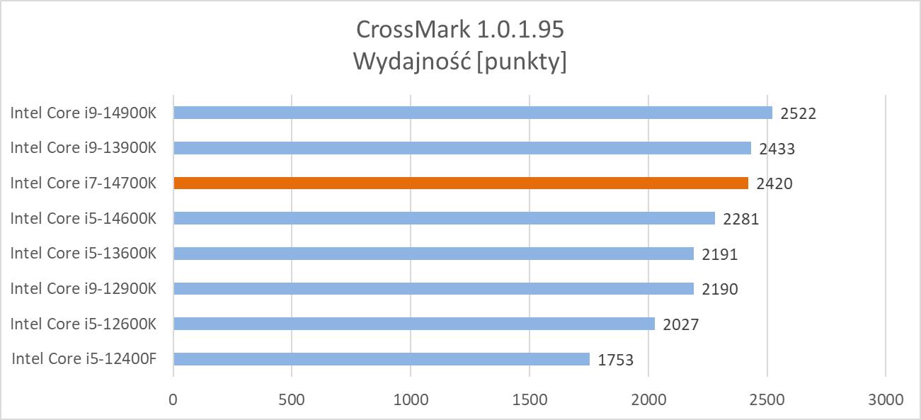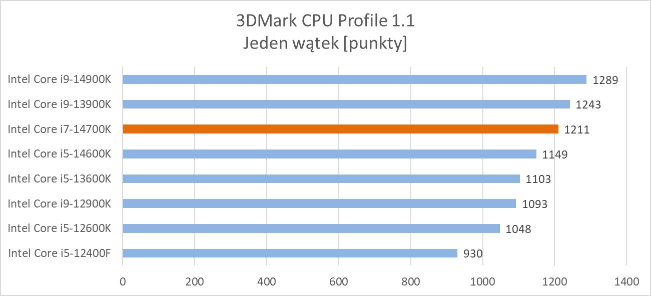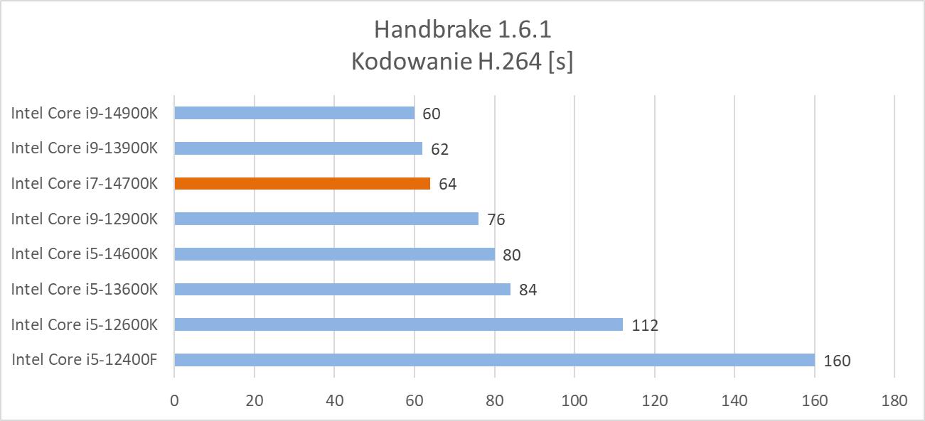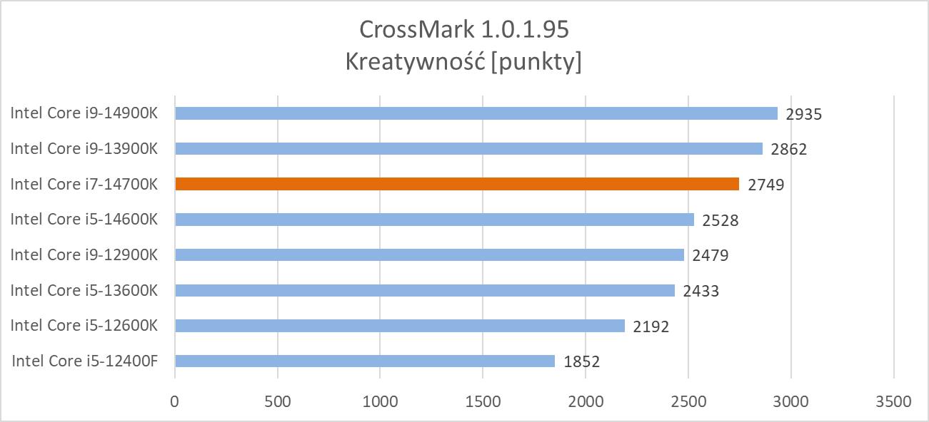 Procesor średnio wypada bardzo blisko i9-13900K. We wszystkich programach znajduje się on na 3 miejscu, zaraz za wspomnianym procesorem. Jest to bardzo dobry wynik, a samo CPU naprawdę bardzo dobrze sprawdzi się w różnych zastosowaniach profesjonalnych. Trzeba też pamiętać, że mamy o 4 rdzenie E więcej niż w przypadku i7-13700K. Sprawia to, że warto tutaj zamiast starszej jednostki jednak zdecydować się na zakup nowszej.