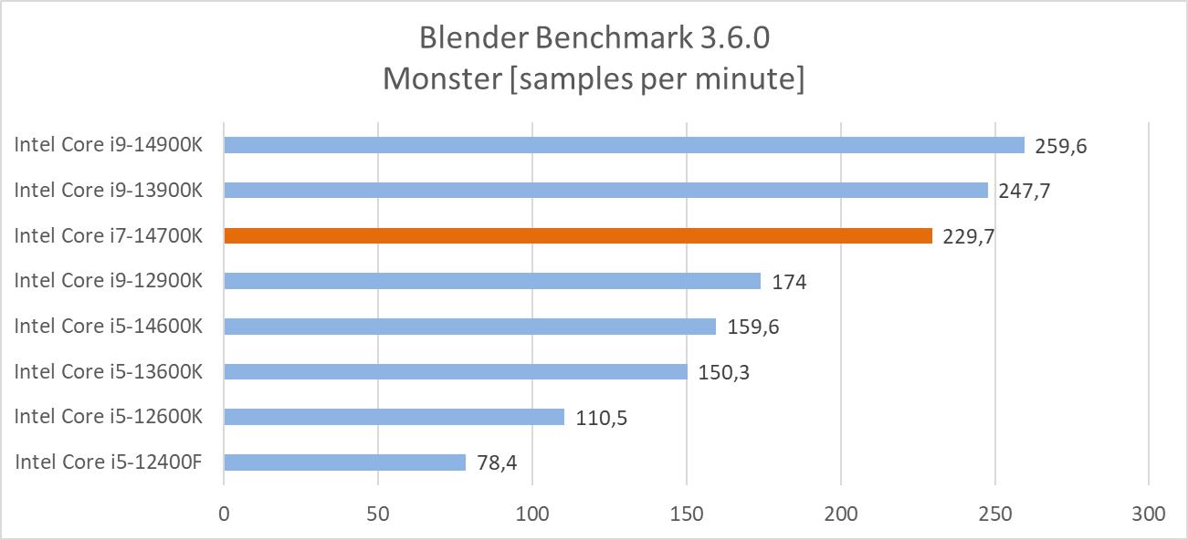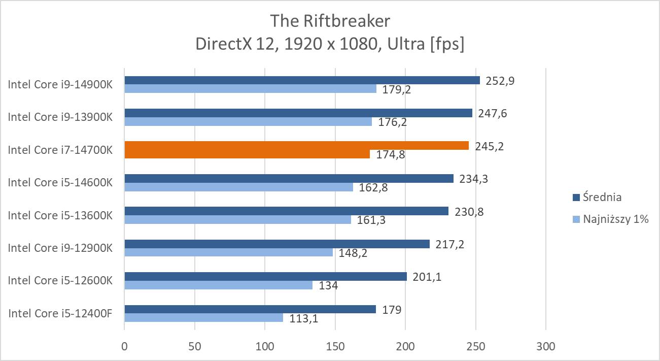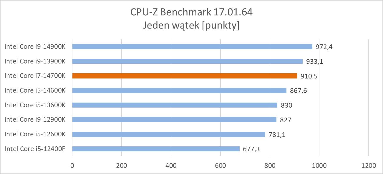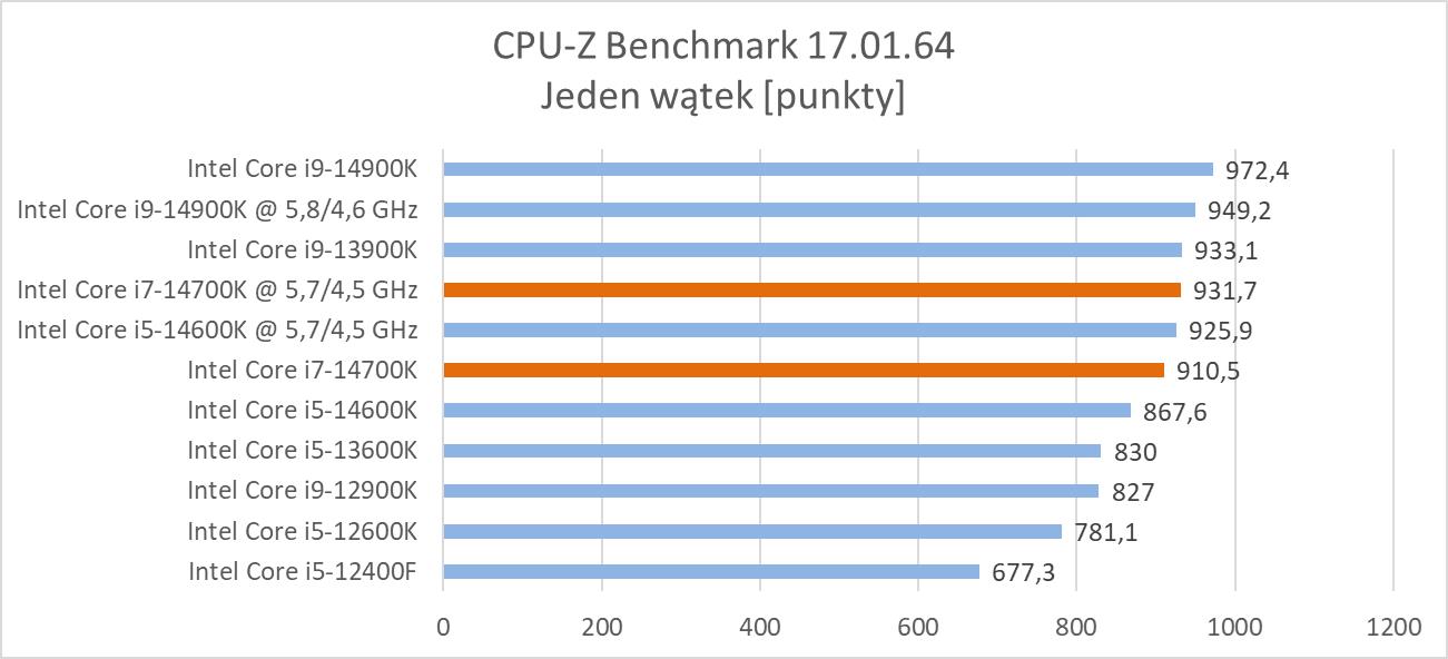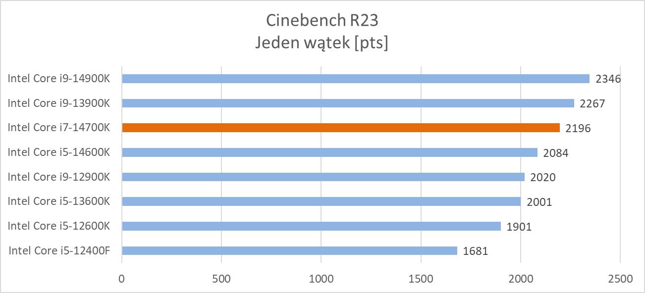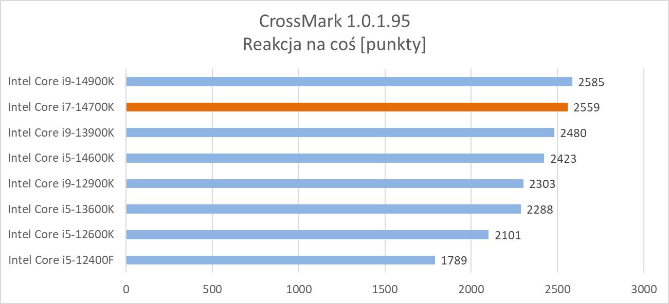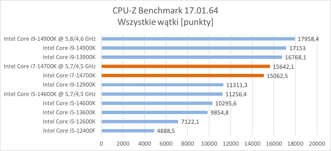 Procesor średnio wypada bardzo blisko i9-13900K. We wszystkich programach znajduje się on na 3 miejscu, zaraz za wspomnianym procesorem. Jest to bardzo dobry wynik, a samo CPU naprawdę bardzo dobrze sprawdzi się w różnych zastosowaniach profesjonalnych. Trzeba też pamiętać, że mamy o 4 rdzenie E więcej niż w przypadku i7-13700K. Sprawia to, że warto tutaj zamiast starszej jednostki jednak zdecydować się na zakup nowszej.