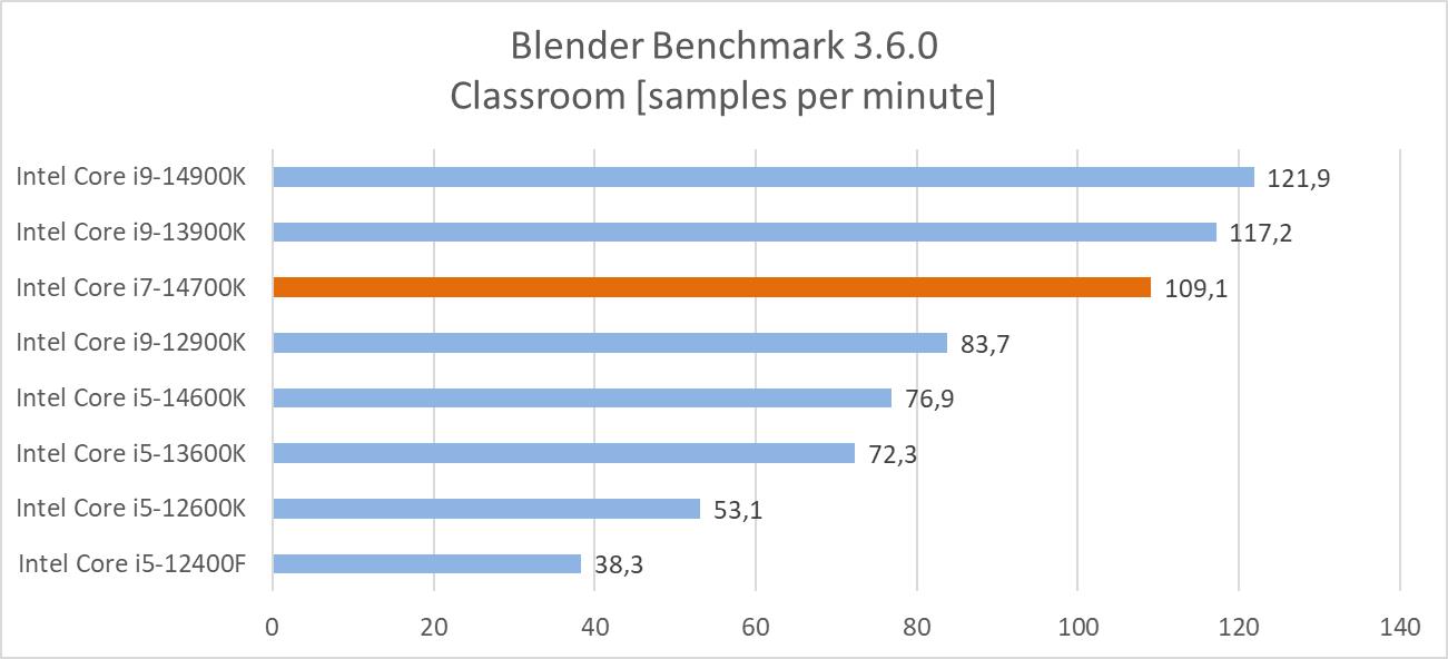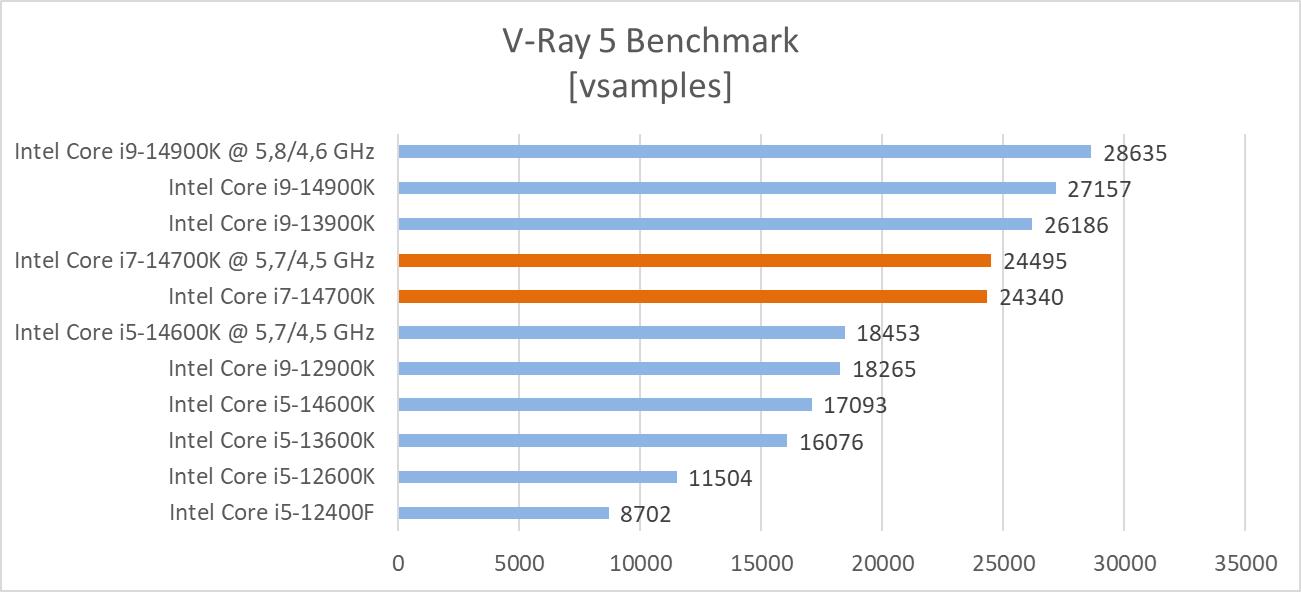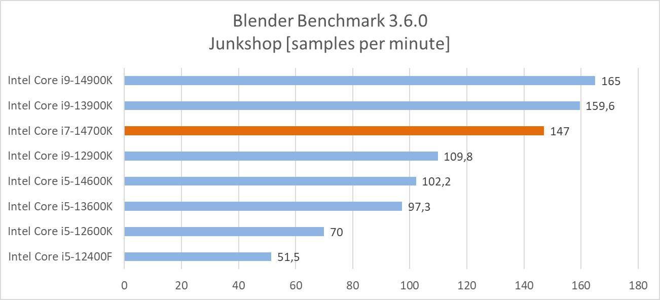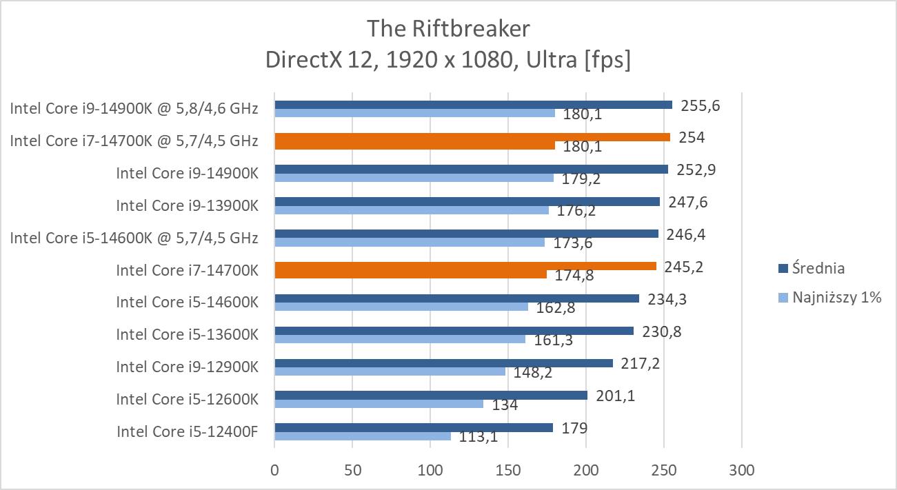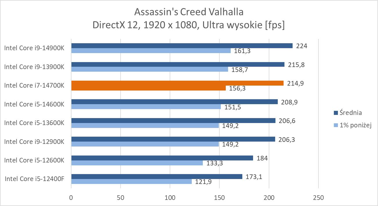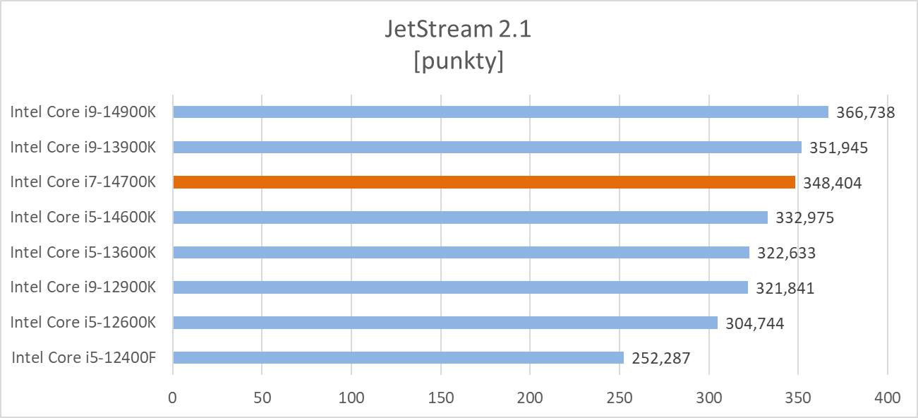 Procesor średnio wypada bardzo blisko i9-13900K. We wszystkich programach znajduje się on na 3 miejscu, zaraz za wspomnianym procesorem. Jest to bardzo dobry wynik, a samo CPU naprawdę bardzo dobrze sprawdzi się w różnych zastosowaniach profesjonalnych. Trzeba też pamiętać, że mamy o 4 rdzenie E więcej niż w przypadku i7-13700K. Sprawia to, że warto tutaj zamiast starszej jednostki jednak zdecydować się na zakup nowszej.