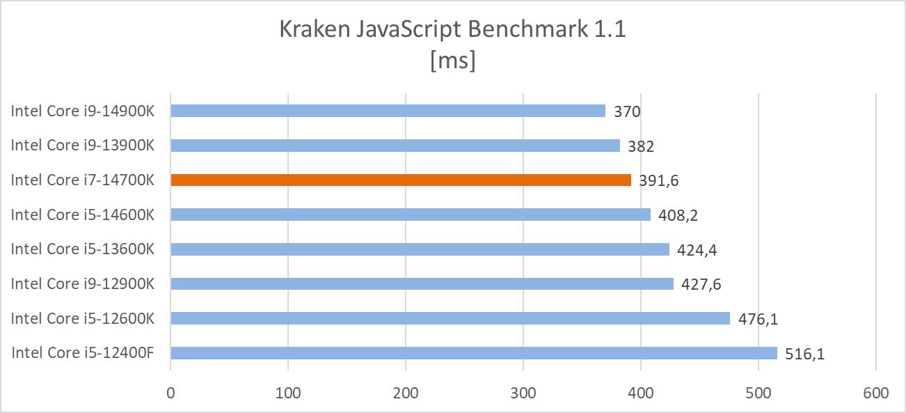 Kolejny benchmark porównuje wydajność w złożonych obliczeniach opartych o JavaScript. Wynik ma kilka różnych składników i podawany jest w milisekundach – interesuje nas całkowity rezultat. W testach wykorzystałem przeglądarkę Google Chrome.