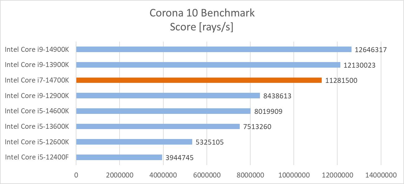 Silnik renderujący Corona dostępny jest Autodesk 3ds Max oraz Cinema 4D. Co ważne, nie wspiera on GPU, więc wydajność CPU jest tutaj kluczowa. W testach skorzystałem z benchmarka przygotowanego przez twórców, który dobrze sprawdza się w praktyce.