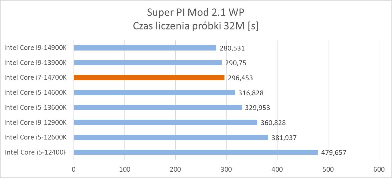 SuperPI liczy liczbę Pi do wskazanej ilości cyfr. Wykorzystuje on do tego algorytm Gauss–Legendre oraz działa tylko na jednym wątku. Jest on bardzo popularny np. podczas zawodów OC. Wykonałem tutaj obliczenia 32 milionów cyfr (32M).