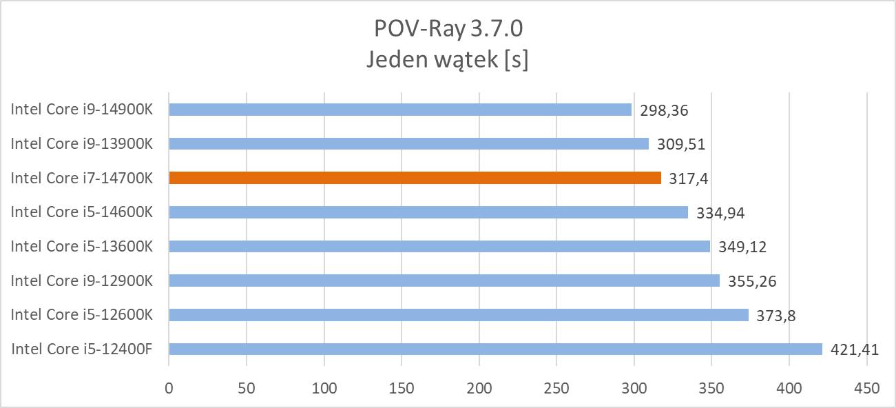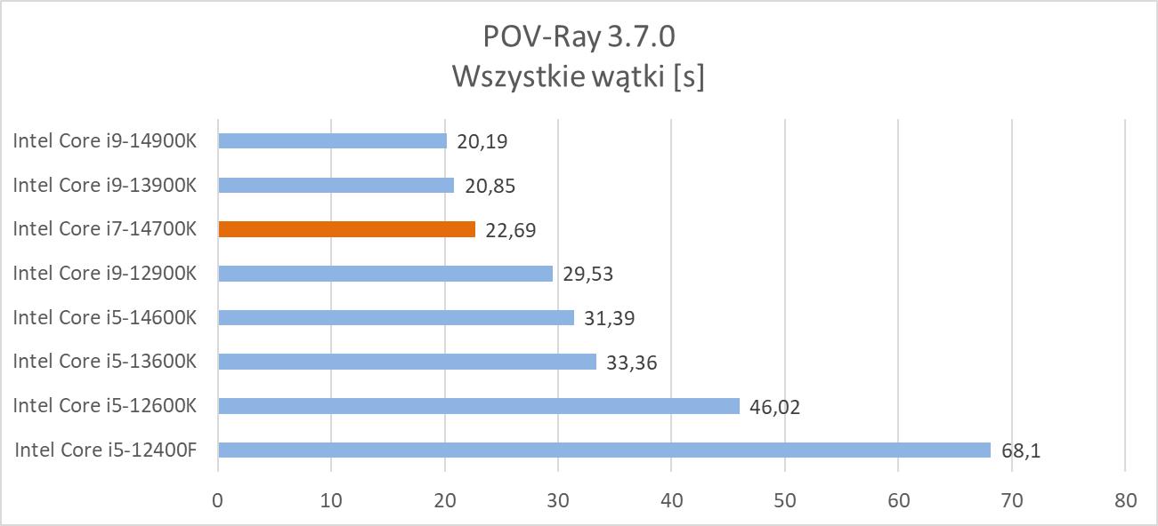 POV-Ray to kolejny program mający wbudowany benchmark. Tym razem pozwala on na tworzenie obrazów z wykorzystaniem ray tracingu i służy głównie do tworzenia grafiki 3D. W testach wykorzystałem benchmark jedno i wielowątkowy.