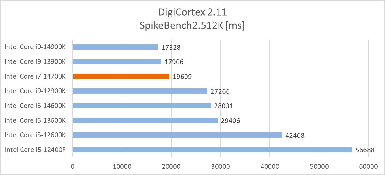 DigiCortex służy do wizualizacji sieci neuronowych oraz symulacji na dużą skalę. Nie zabrakło tutaj wykorzystania dokładnych modeli synaps, ich plastyczności oraz neuronów. Do testów wykorzystałem benchmark SpikeBench2.512K (524288 neuronów, 100M synaps), a wyniki to czas budowania symulacji.