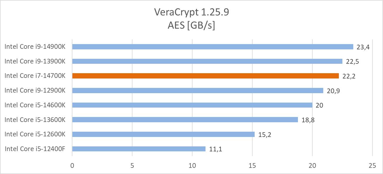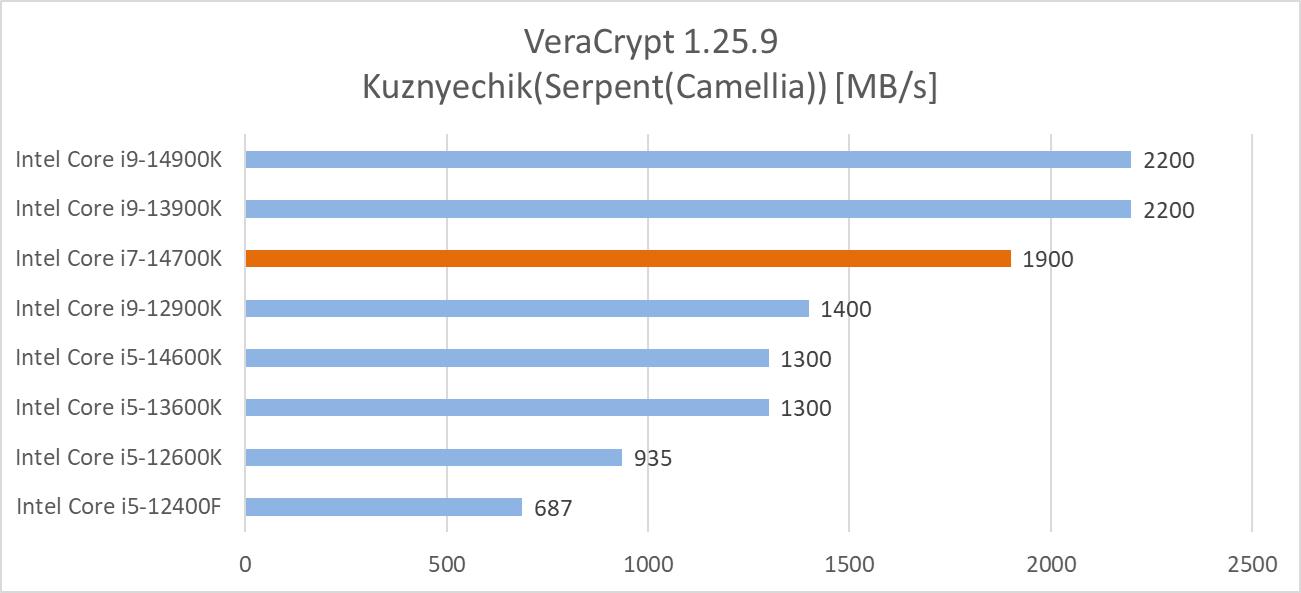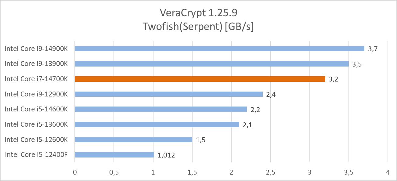VeraCrypt to oficjalny następca TruCrypt. Jest to oprogramowanie open-source więc nie ma co się dziwić, że jest naprawdę popularny. Program ma wbudowany benchmark, który wykorzystałem w sprawdzeniu wydajności procesorów. Na wykresach poniżej znajdziecie średnie wyniki trzech testów: AES, Twofish(Serpent) oraz Kuznyechik(Serpent(Camellia)).