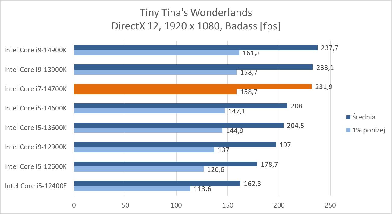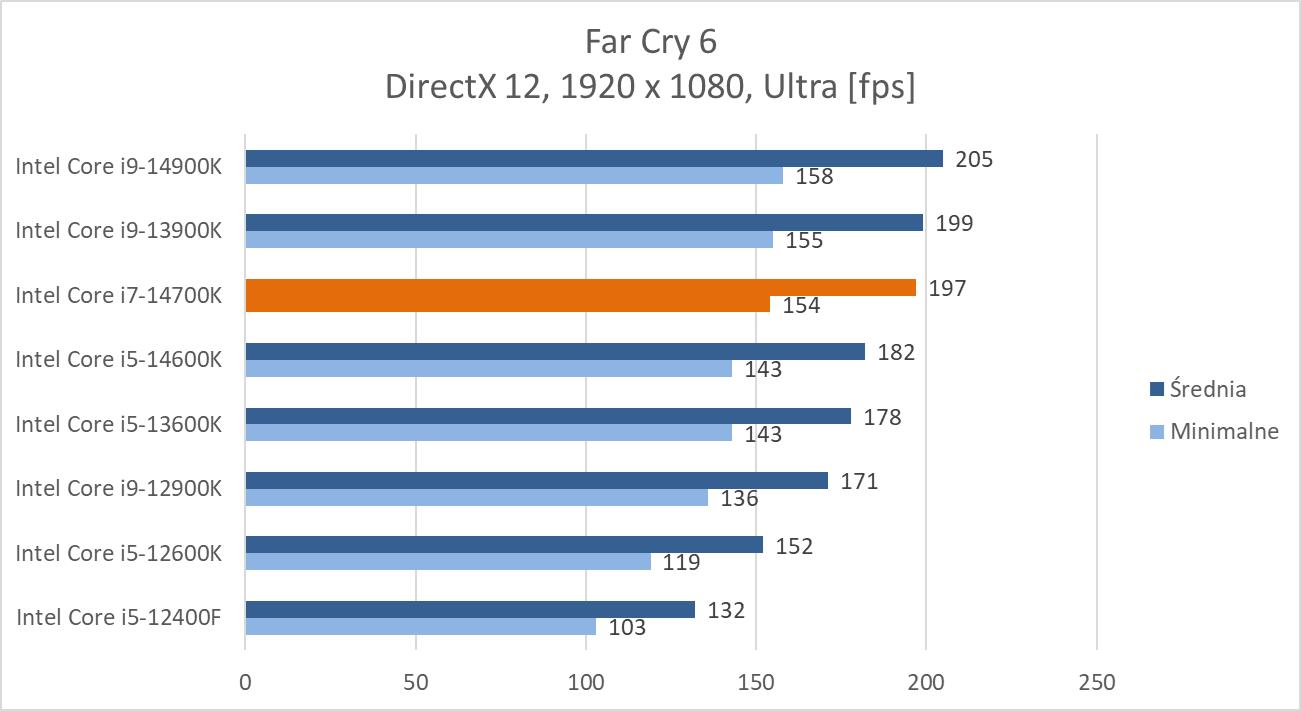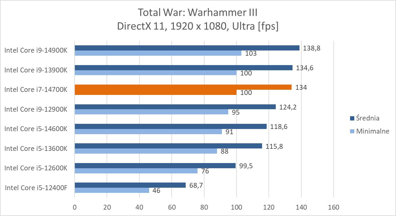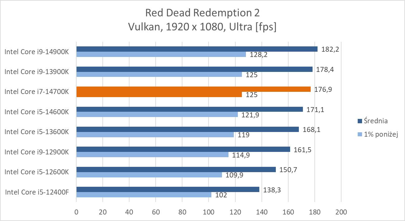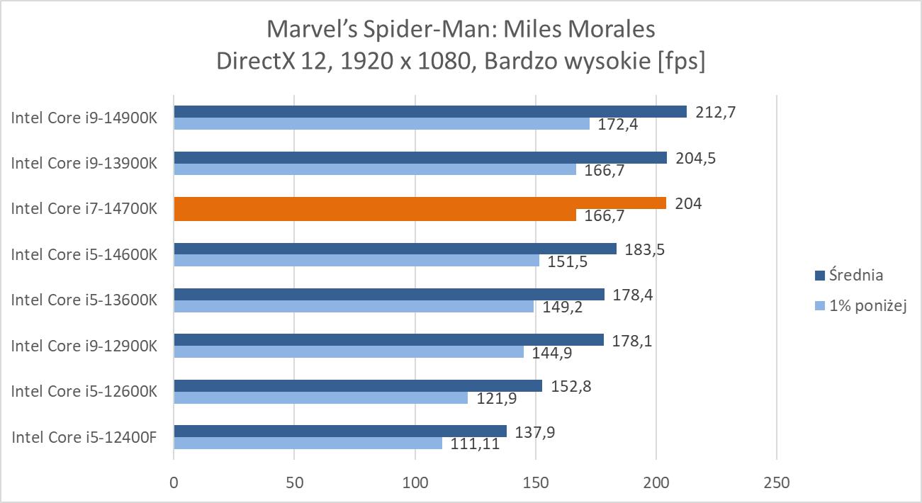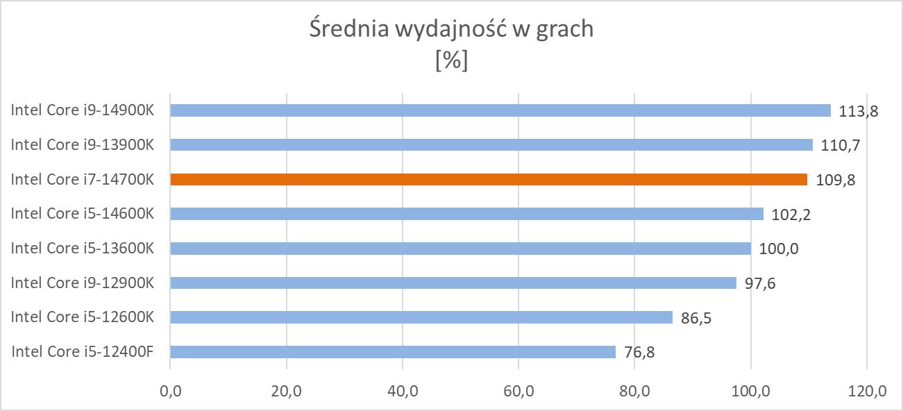W grach procesor potrafi doganiać i9-13900K. Średnia wydajność jest bardzo bliska tej konstrukcji, widać to też po wynikach we wszystkich grach, w których procesor plasuje się bardzo blisko wspomnianego modelu. Wydajność jest więc bardzo dobra, w szczególności jak na konstrukcję z serii i7.