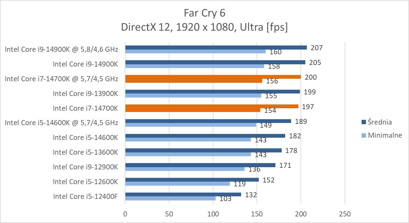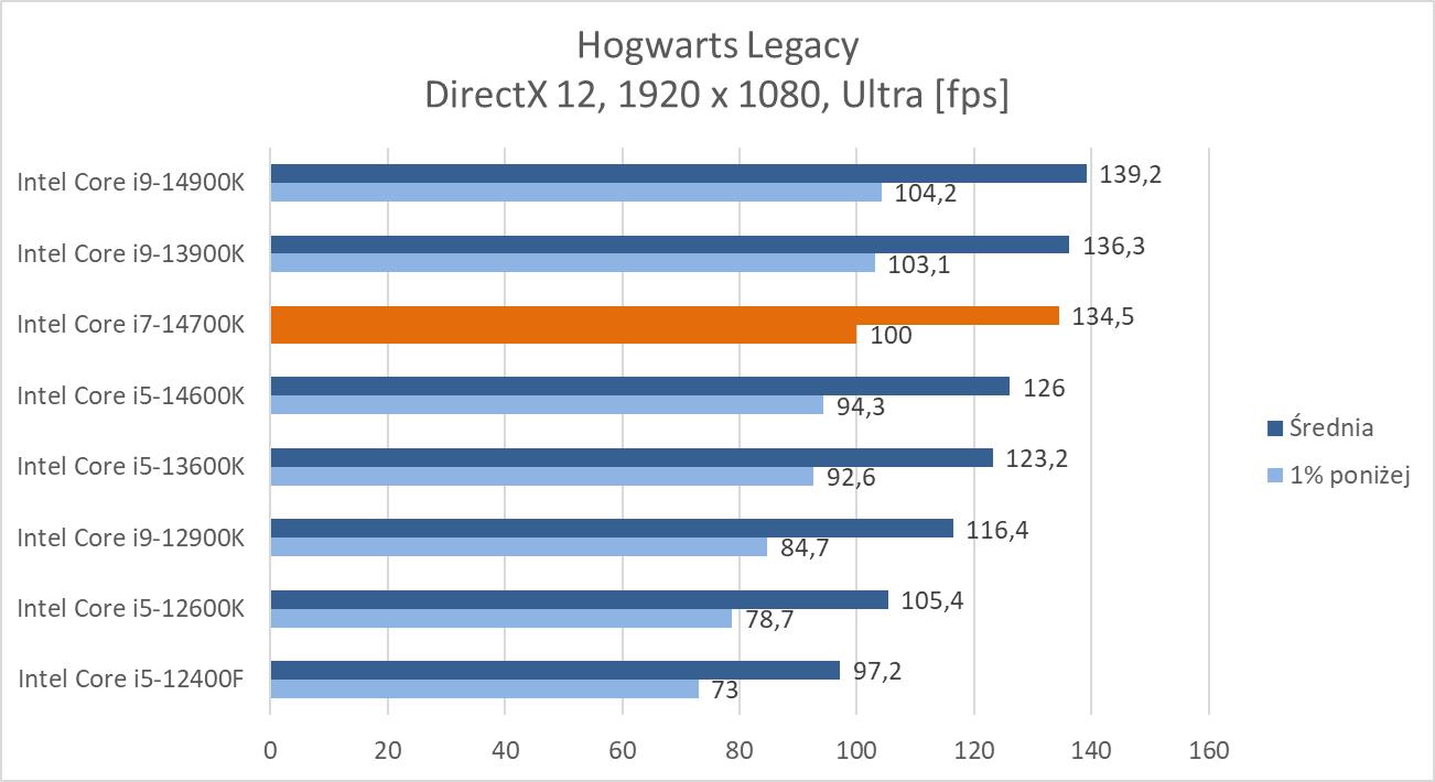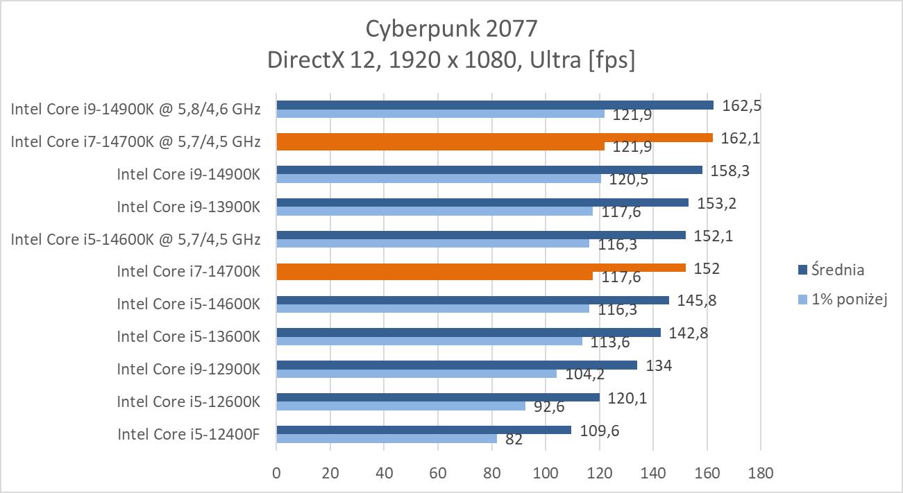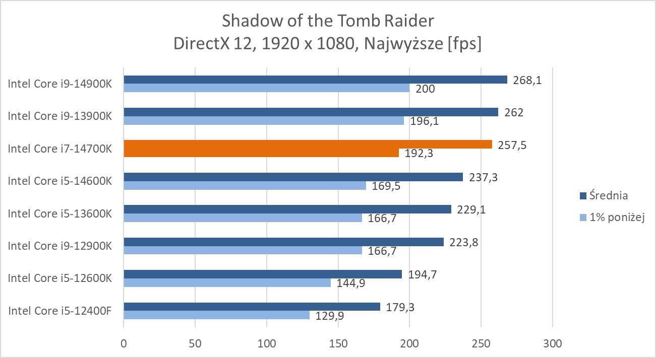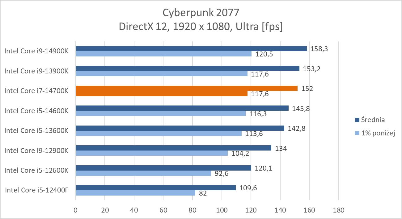 Intel Core i7-14700K kupicie za ok. 1950 zł, podczas gdy poprzednik kosztuje ok. 1800 zł. Naszym zdaniem, jeśli kupujecie nowy procesor to warto tutaj dopłacić do 14700K. Ma on więcej rdzeni E i oferuje po prostu lepszą wydajność, która jest bliska i9-13900K w programach i grach. W tej cenie jest to też bardzo dobra konstrukcja w szczególności, jeśli połączycie ją ze szybkimi pamięciami DDR5 pokroju 7200 MHz. Pamiętajcie też, że za ok. 1820 zł kupicie model i7-14700KF, który nie ma zintegrowanej karty graficznej. Jest to też ciekawa opcja w szczególności, jeśli jesteście już na skraju zaplanowanego budżetu na nowy komputer.