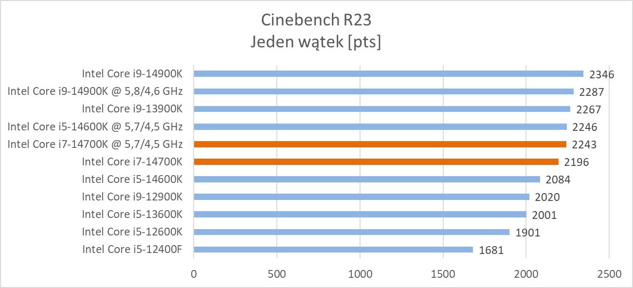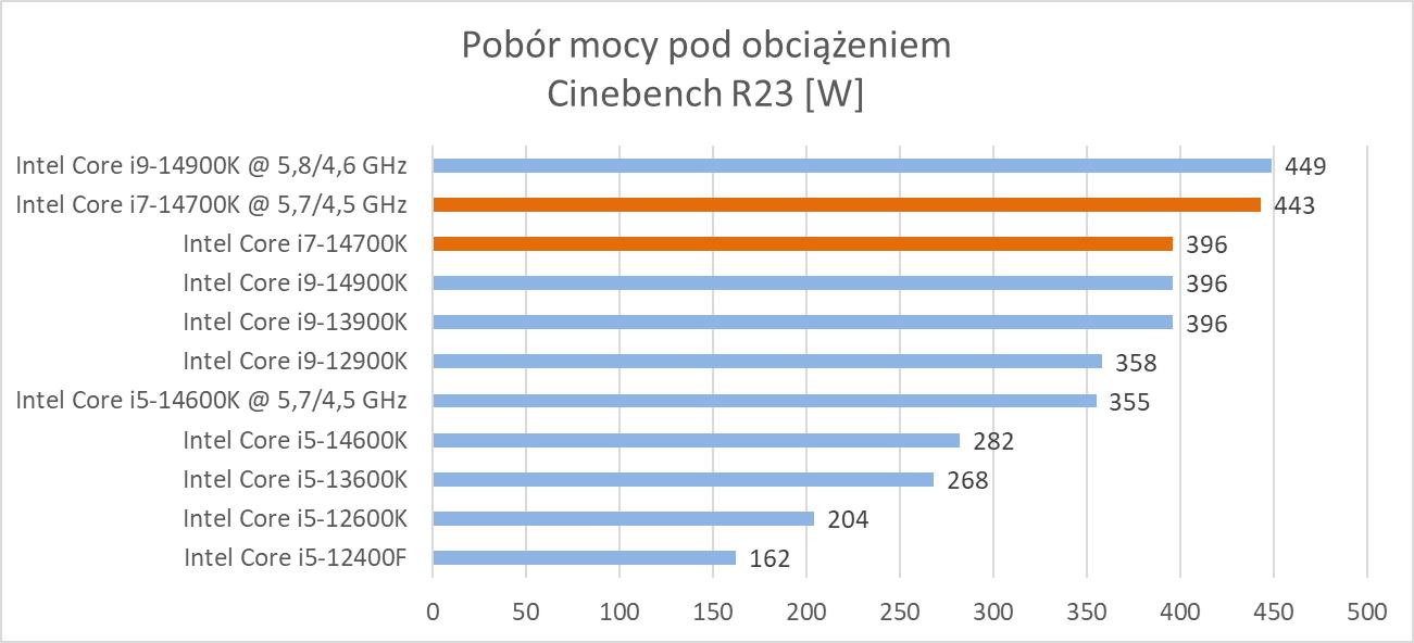 Procesor pod obciążeniem Cinebench R23 dobija do założonego limitu mocy (253 W) więc pobór przez całą platformę jest taki sam jak w przypadku procesorów i9. Przy takim stawieniu AiO 360 dobrej jakości powinno sobie poradzić z odprowadzeniem ciepła i takie chłodzenie jest tak naprawdę wymagane do i7-14700K. Procesor możecie też lekko podkręcić, ale musicie mieć na uwadze, że temperatury będą znacznie wyższe. Po OC i zdjęciu limitów mocy praca przy 100 stopniach przy obciążeniu pokroju Cinebench R23 jest standardem. Po OC różnice w programach nie są duże, ale w grach można zyskać trochę fps-ów.