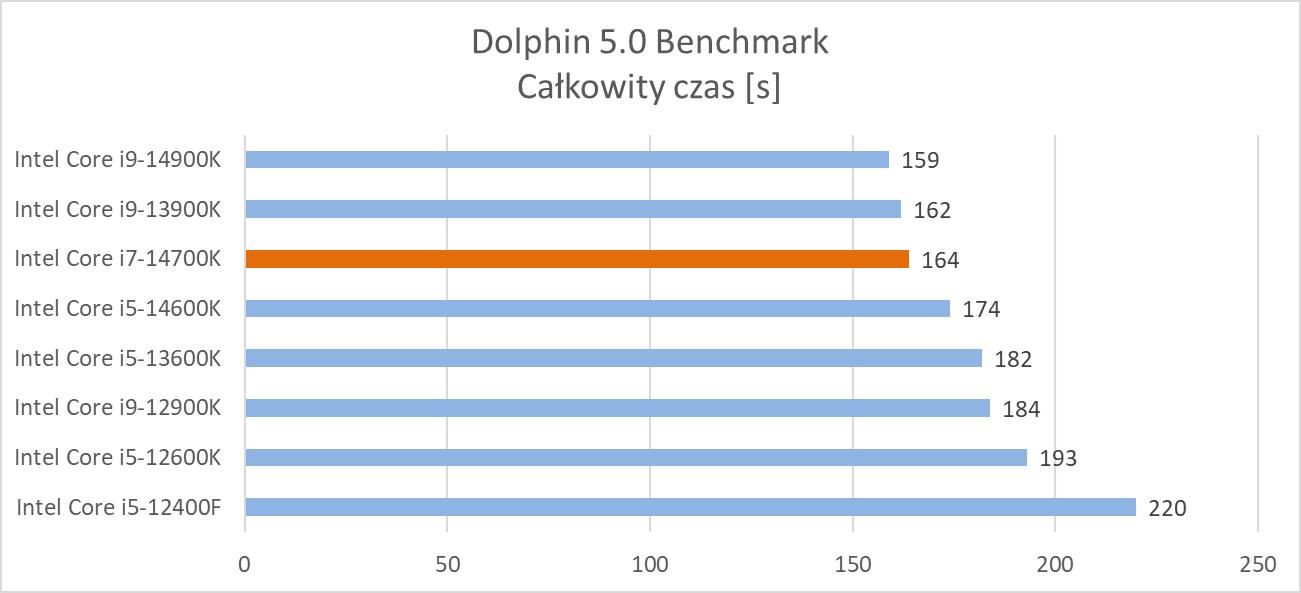 Dolphin pozwala na emulowanie dwóch konsol Nintendo: Wii i GameCube. Dzięki niemu można grać w gry konsolowe w rozdzielczości 1920 x 1080 na komputerze. Wykorzystałem benchmark CPU, a wynik to całkowity czas działania.