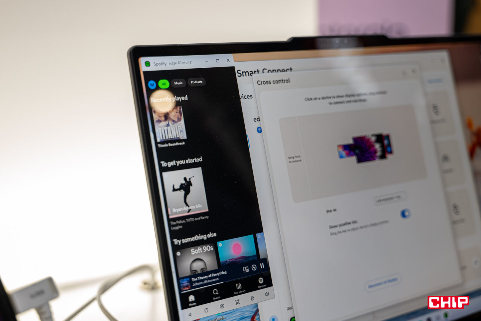 Ekrany, po których kursor przejeżdża bez zawahania to faktycznie coś imponującego. Ich położenie względem monitora ustawimy w aplikacji Smart Connect na komputerze dokładnie tak samo, jak aranżuje się monitory w Windowsie. Wśród funkcji umilających życie z pewnością ucieszy was, że podcast lub ulubioną playlistę będziecie mogli przenieść z jednego urządzenia na drugiego bez problemu. Co prawda niektóre aplikacje zapisują postępy między urządzeniami, ale nie jest to regułą.