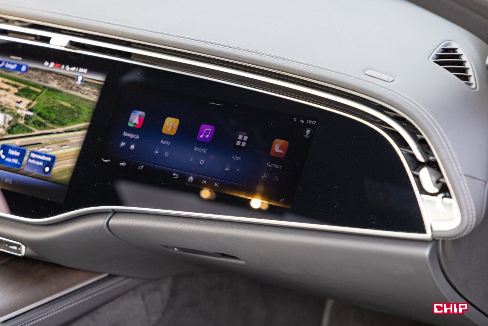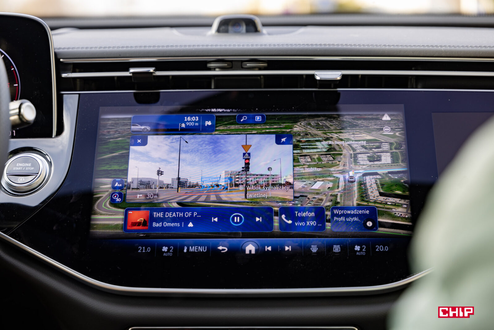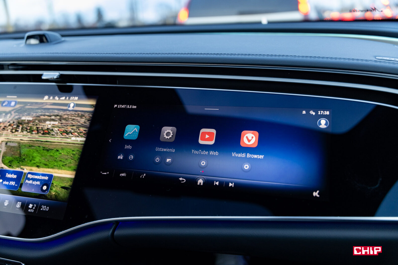 Żarty żartami, ale naprawdę trudno jest mi usprawiedliwić obecność trzeciego ekranu poza tym, że jest to zwyczajnie bardzo efektowne. Za jego pomocą możemy uruchomić wspomnianą nawigację, sterować multimediami, zmieniać ustawienia dźwięku, a nawet podłączyć słuchawki Bluetooth i słuchać własnej muzyki z zainstalowanego Spotify. Nie rozumiem jednak jednego. Auto wie, czy na fotelu pasażera ktoś siedzi. Pasażer może wywołać asystenta głosowego i jeśli poprosi o włączenie podgrzewania fotela, to auto wie, że chodzi o miejsce pasażera. To w takim razie, dlaczego w trakcie jazdy pasażer nie może skorzystać z zainstalowanego YouTube’a? Jasne, możemy mieć skrajną sytuację, że kierowca posadzi obok siebie worek ziemniaków i w ten sposób oszuka system, ale mimo wszystko, przydałaby się jakaś opcja na korzystanie z multimedialnych możliwości nie tylko na postoju.