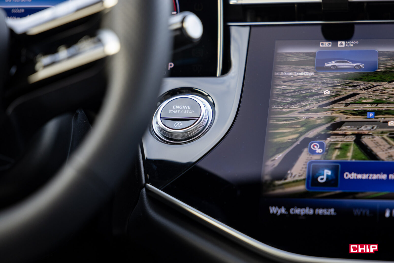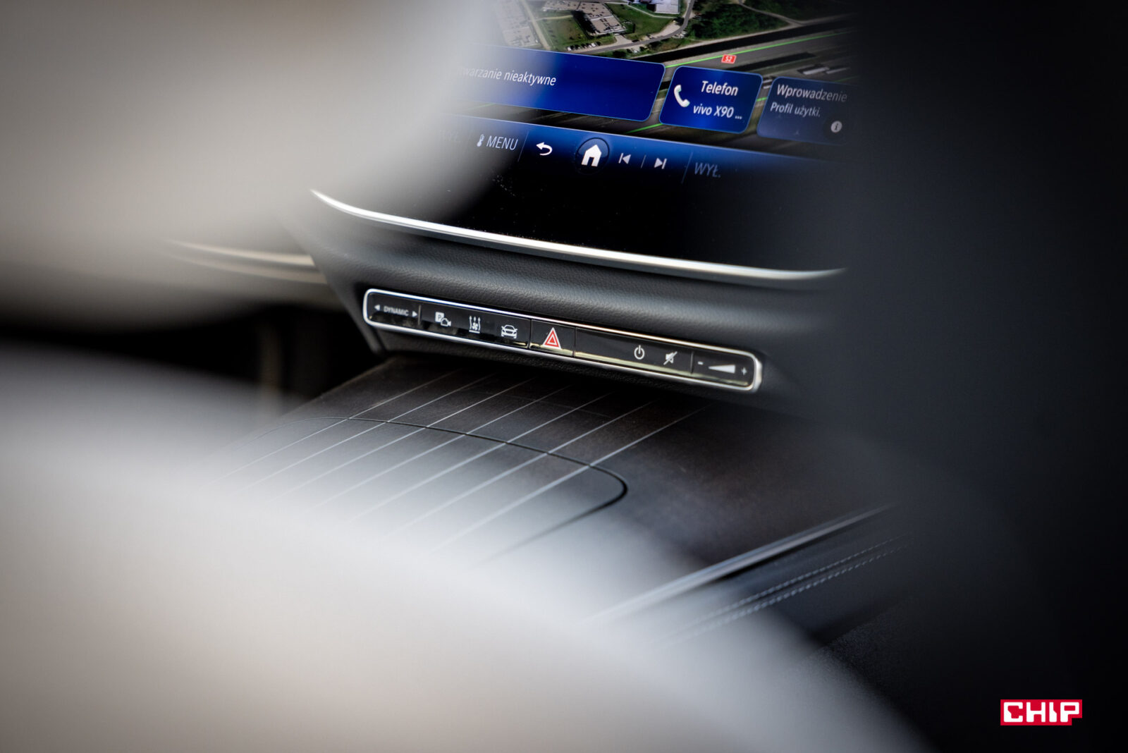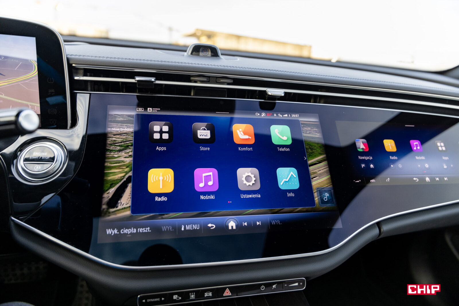 Żarty żartami, ale naprawdę trudno jest mi usprawiedliwić obecność trzeciego ekranu poza tym, że jest to zwyczajnie bardzo efektowne. Za jego pomocą możemy uruchomić wspomnianą nawigację, sterować multimediami, zmieniać ustawienia dźwięku, a nawet podłączyć słuchawki Bluetooth i słuchać własnej muzyki z zainstalowanego Spotify. Nie rozumiem jednak jednego. Auto wie, czy na fotelu pasażera ktoś siedzi. Pasażer może wywołać asystenta głosowego i jeśli poprosi o włączenie podgrzewania fotela, to auto wie, że chodzi o miejsce pasażera. To w takim razie, dlaczego w trakcie jazdy pasażer nie może skorzystać z zainstalowanego YouTube’a? Jasne, możemy mieć skrajną sytuację, że kierowca posadzi obok siebie worek ziemniaków i w ten sposób oszuka system, ale mimo wszystko, przydałaby się jakaś opcja na korzystanie z multimedialnych możliwości nie tylko na postoju.