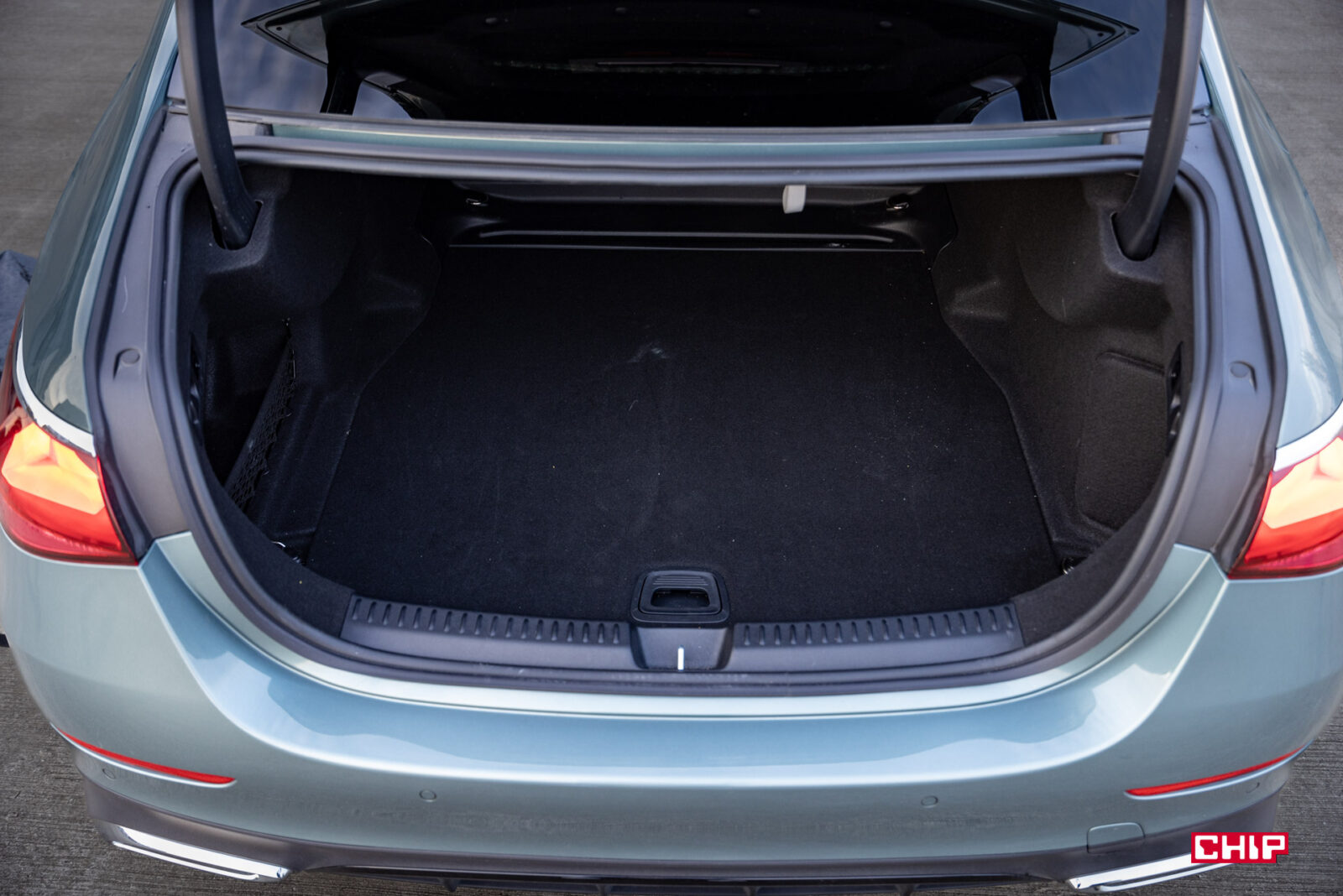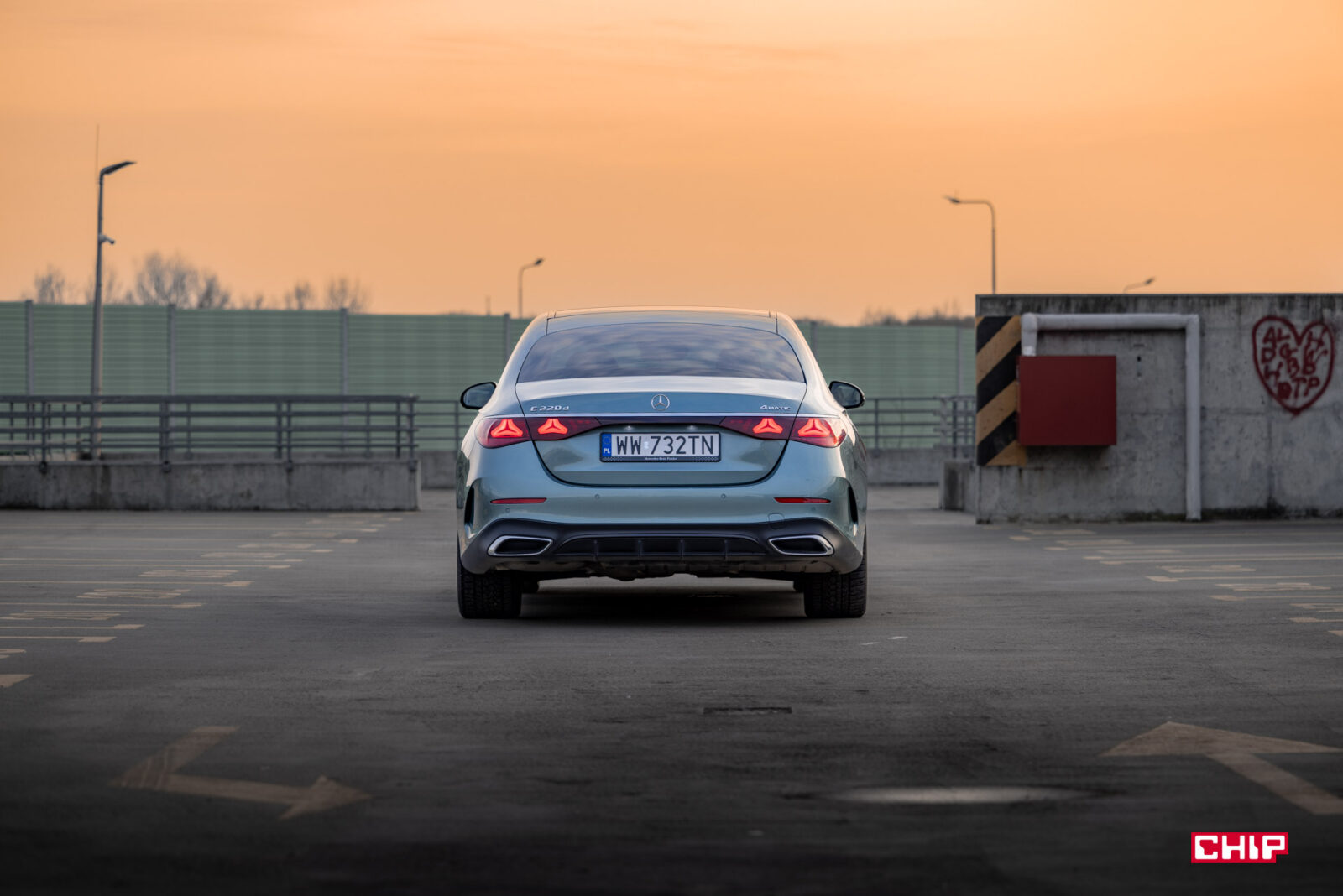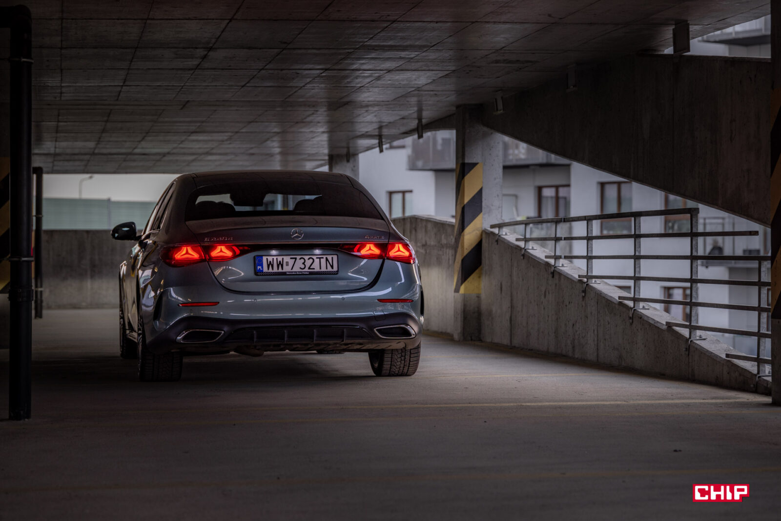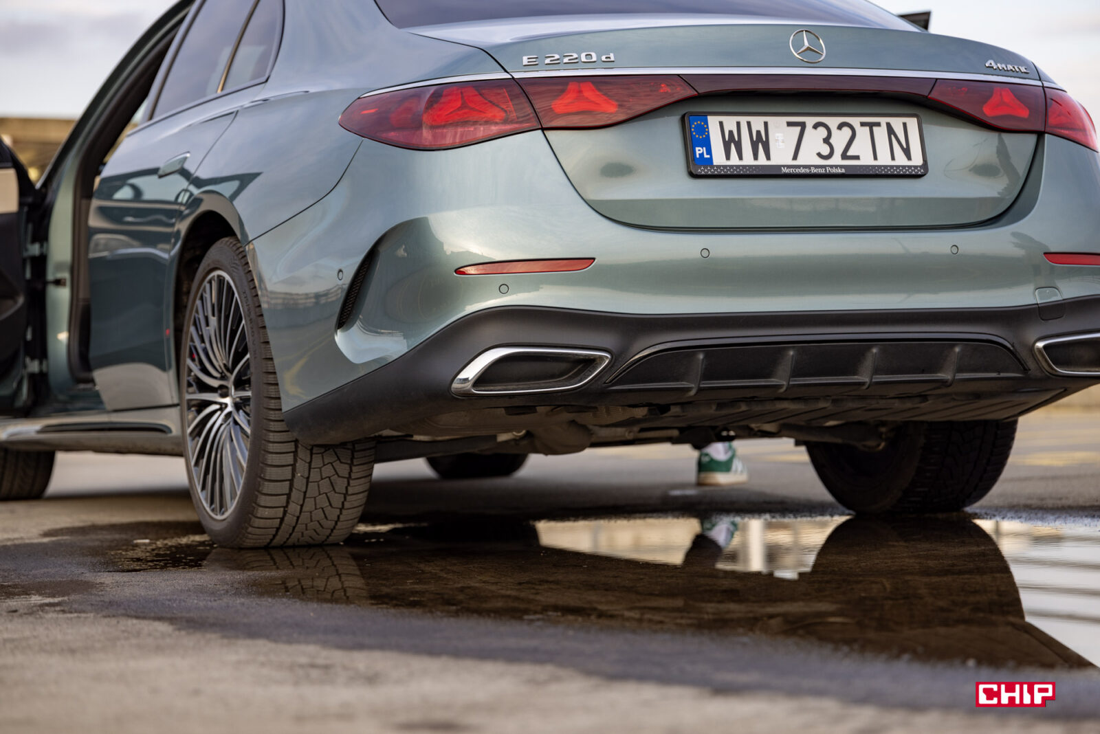 Z tyłu zgrzytem na pewno są atrapy wydechów. Są zaślepione, a żeby dostrzec faktyczną końcówkę wydechu, trzeba się dosyć mocno zagłębić pod auto. Ale nawet z nimi zadek nowej E-klasy prezentuje się zacnie. Co ciekawe, kamera cofania nie jest tutaj umieszczona w logo Mercedesa, choć też jest wysuwana. A konkretnie pojawia się pod klapą, niedaleko przycisku otwierającego bagażnik.