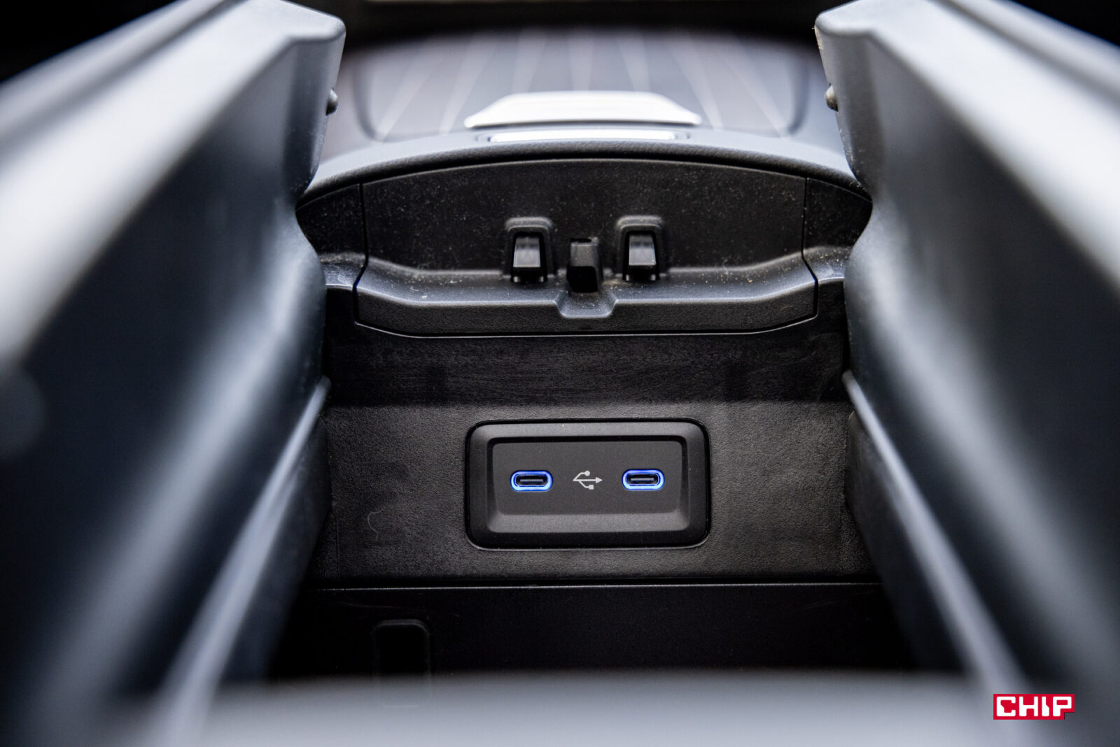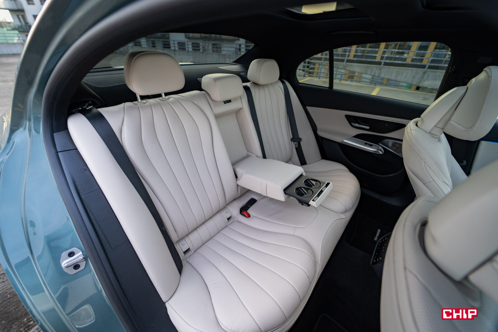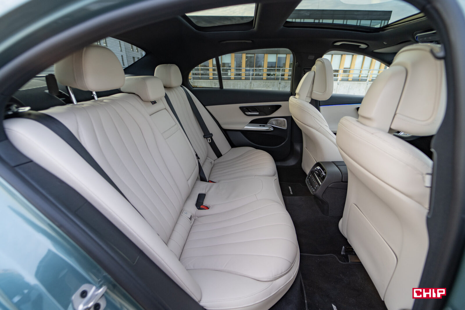 Opcjonalnie podgrzewane mogą być też skrajne fotele tylnej kanapy, na której jest bardzo dużo miejsca. Idąc klasyfikacją literalną Mercedesa, miejsca jest więcej niż w klasie C i mniej niż w klasie S. Bez problemu zmieszczą się tu trzy dorosłe osoby, ale ta kanapa zwyczajnie była projektowana na dwóch pasażerów. Z tyłu mamy dostęp do panelu klimatyzacji oraz portów USB-C, umieszczonych pod nim.