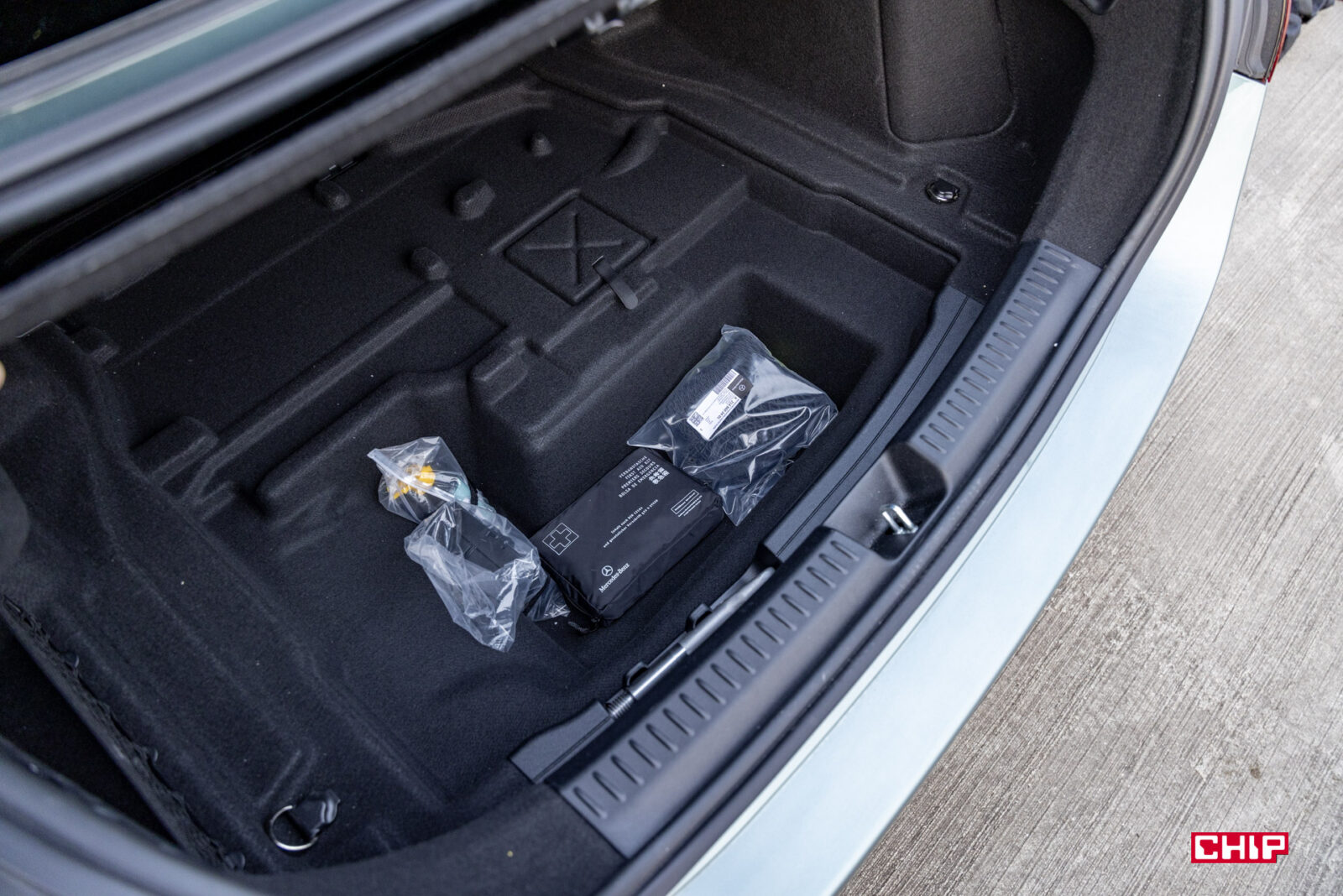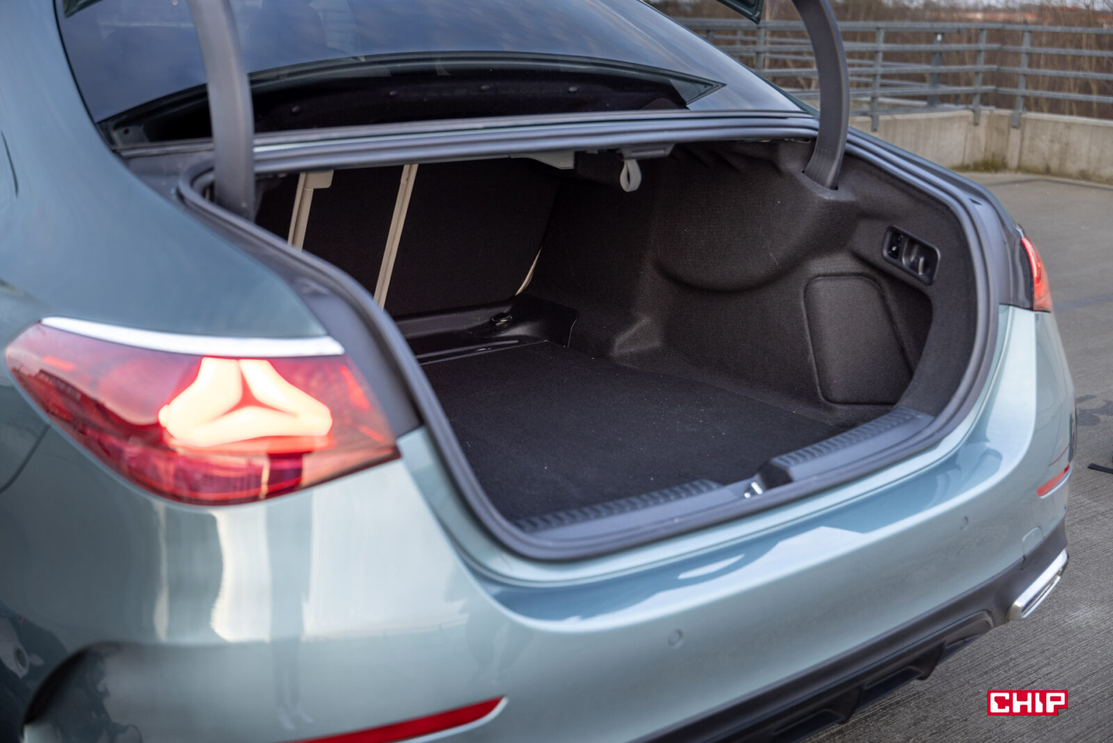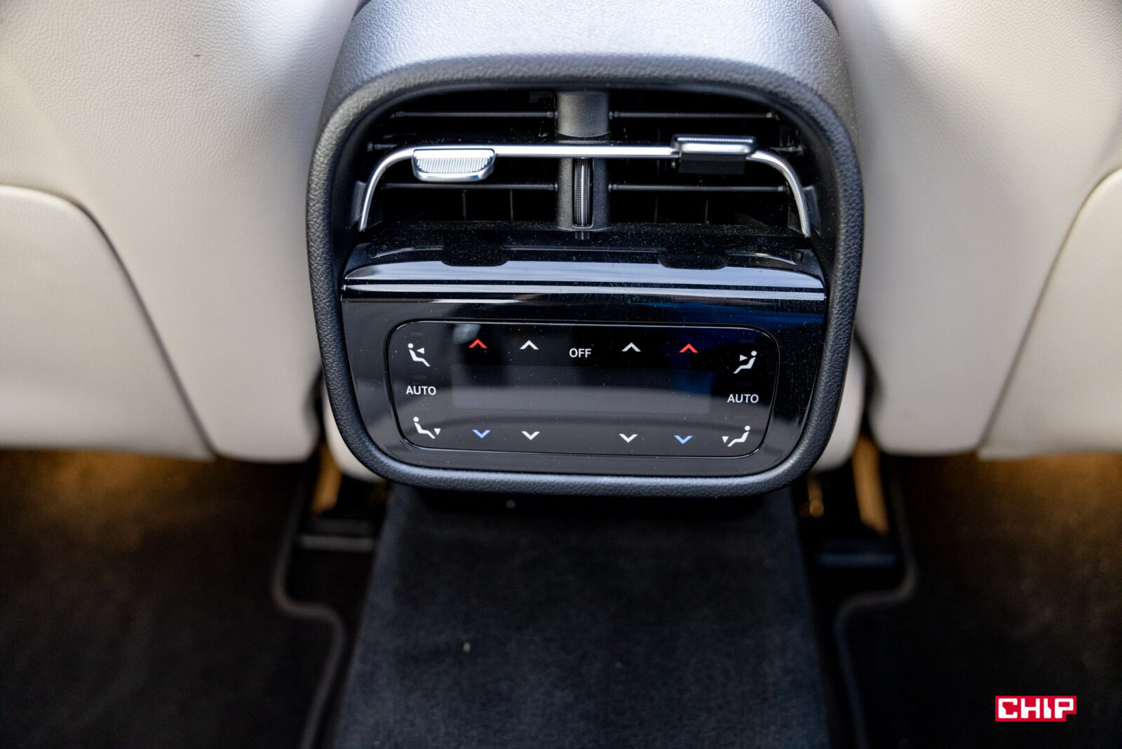 Opcjonalnie podgrzewane mogą być też skrajne fotele tylnej kanapy, na której jest bardzo dużo miejsca. Idąc klasyfikacją literalną Mercedesa, miejsca jest więcej niż w klasie C i mniej niż w klasie S. Bez problemu zmieszczą się tu trzy dorosłe osoby, ale ta kanapa zwyczajnie była projektowana na dwóch pasażerów. Z tyłu mamy dostęp do panelu klimatyzacji oraz portów USB-C, umieszczonych pod nim.