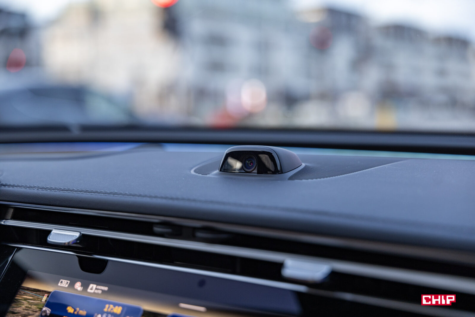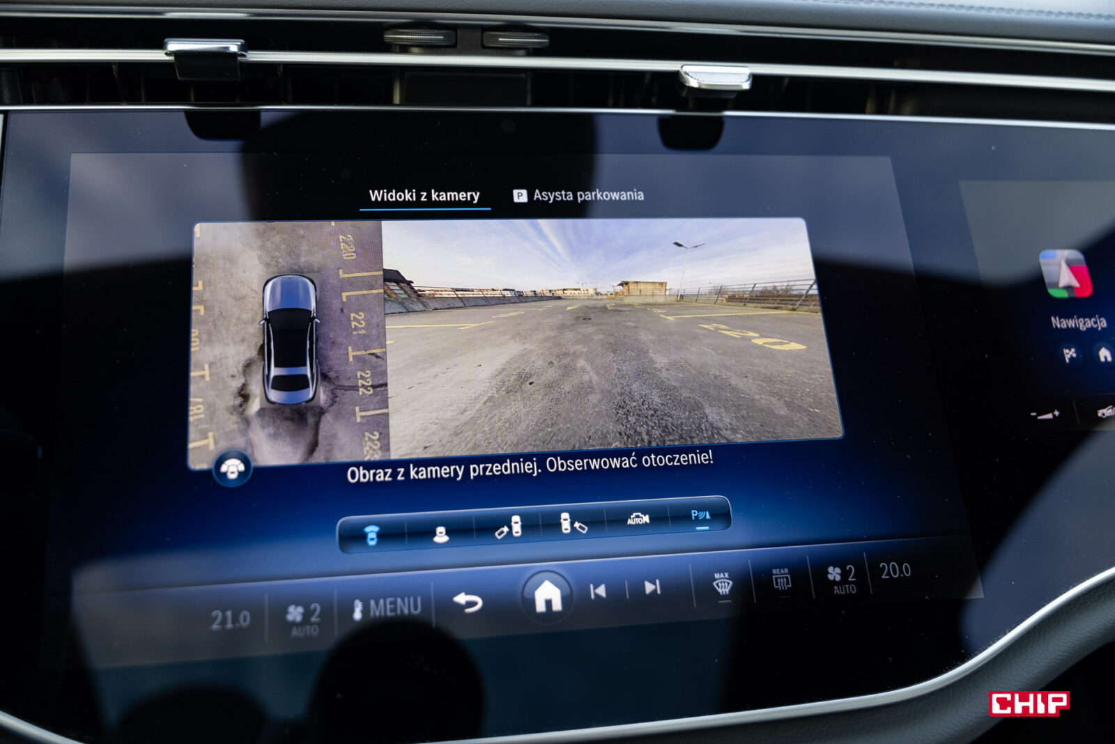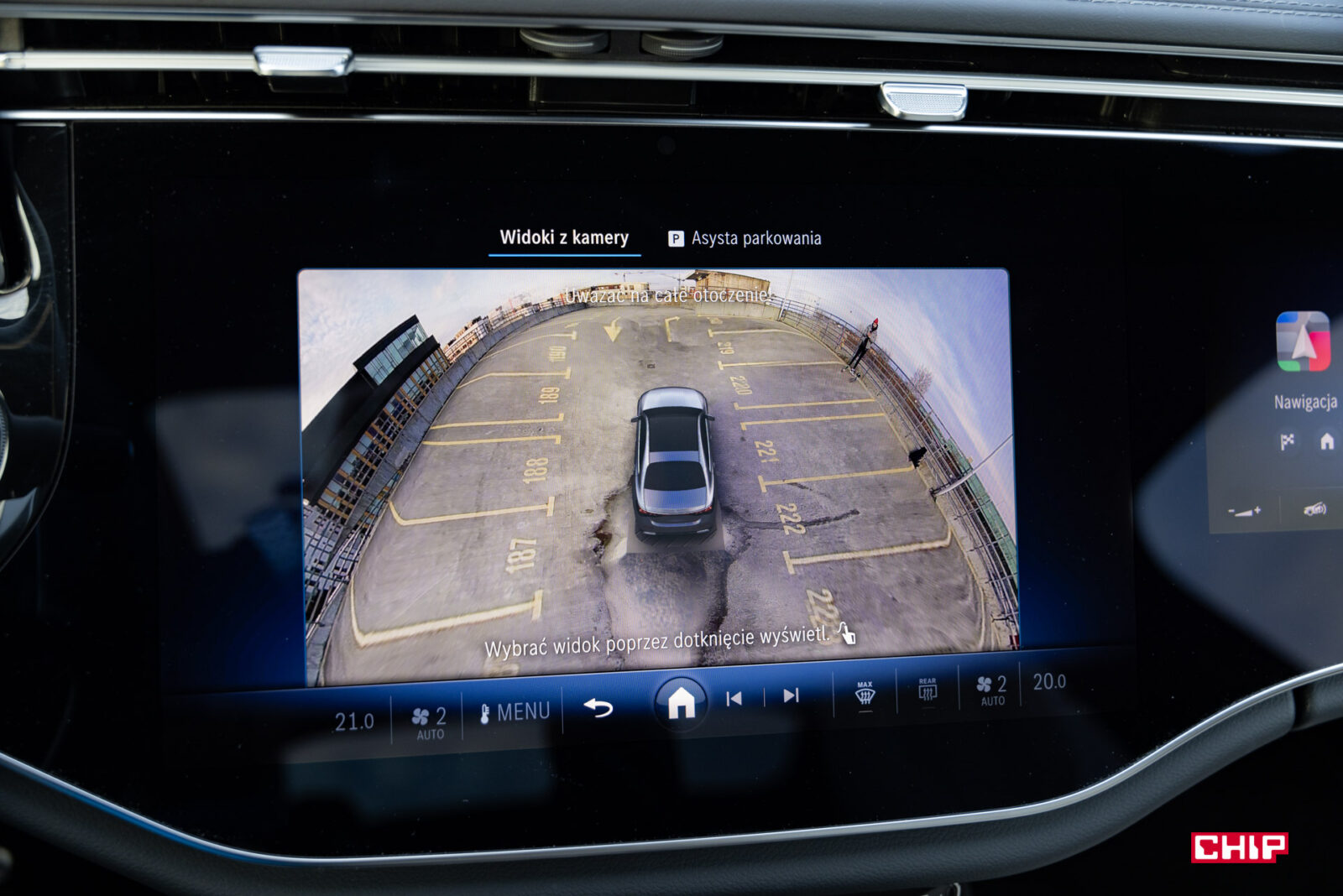 A co to jest na szczycie deski rozdzielczej? To obiektyw kamery, jednej z dwóch, które możemy opcjonalnie zamontować i wykorzystywać do monitorowania wnętrza i otoczenia pojazdu. Wymaga to podłączenia dodatkowej zewnętrznej pamięci lub skonfigurowania usług chmurowych. Wtedy zawsze mamy wgląd w to, co dzieje się wewnątrz auta, z kolei drugi kamer znajdująca się za lusterkiem pełni rolę wideorejestratora. Poza tym nie mogło zabraknąć systemu kamer 360 z bardzo długą listą dostępnych widoków i jakość obrazu, do czego Mercedes zdążył nas przyzwyczaić, jest absolutnie topowa.