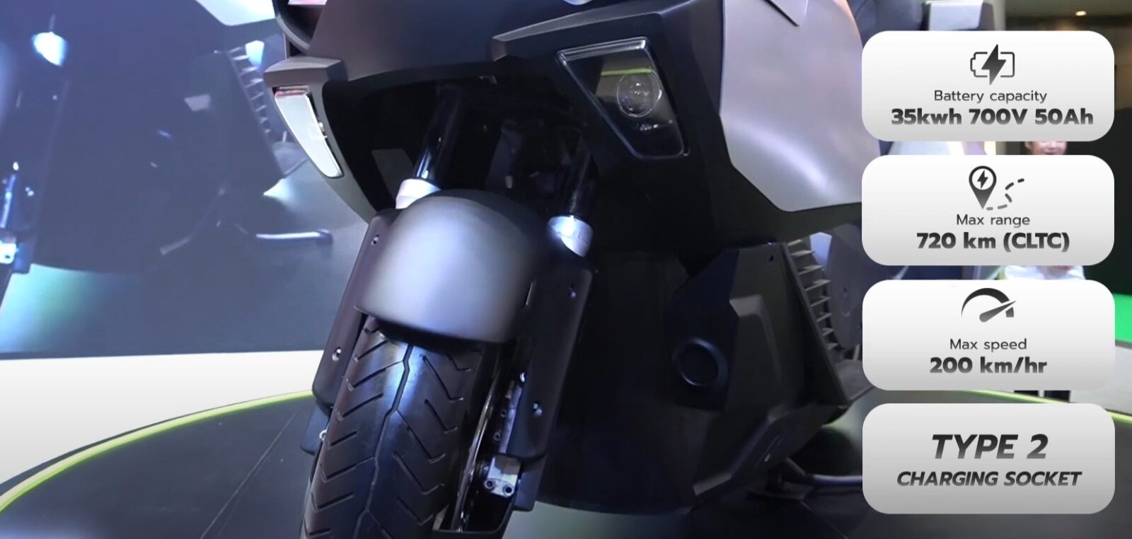 Na wspomniany napęd składa się objęty ciągle tajemnicą silnik oraz 700-V akumulator o pojemności 35 kWh, a więc duet, który ma pozwalać jednośladowi w osiąganiu prędkości maksymalnej na poziomie 200 km/h i pokonywaniu dystansów rzędu nawet 720 kilometrów na jednym ładowaniu złączem TYPE2. Przynajmniej wedle procedury testowej CLTC, która zauważalnie różni się od WLTP, do którego jesteśmy przyzwyczajeni w Europie. Samo ładowanie od 20 do 80 procent przy odpowiednio szybkiej ładowarce ma trwać około 20 minut.