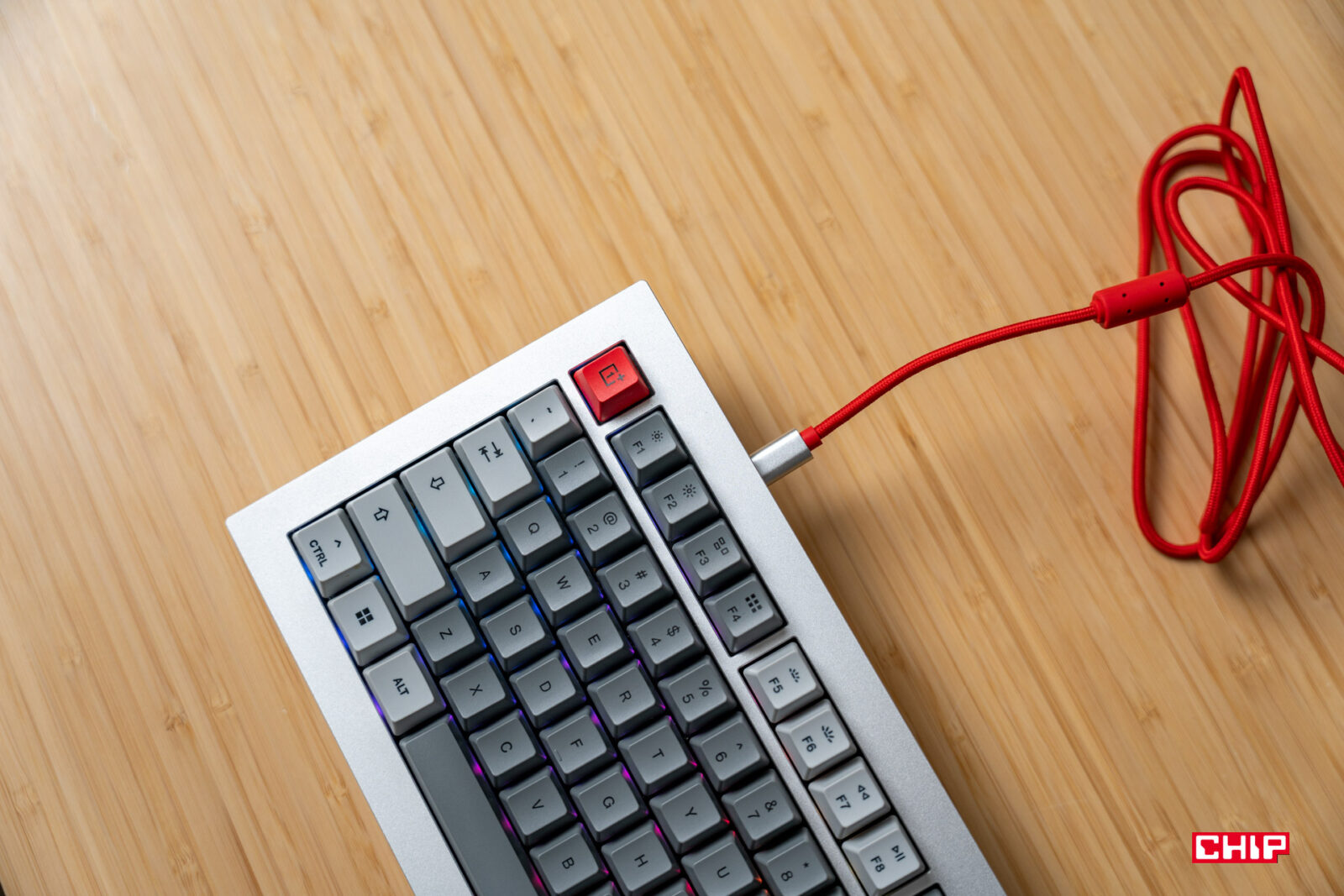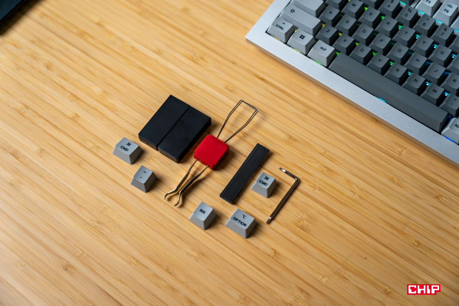 W zestawie znajdziemy charakterystyczny dla OnePlusa, czerwony kabel USB, dodatkowe przyciski dla układu pod system Mac, klucz pozwalający na rozkręcenie obudowy, dodatkowy komplet śrubek i narzędzie ułatwiające demontaż klawiszy. Mamy tu też gumowe naklejki, tylko nie do końca wiem do czego mogą się przydać. Klawiatura, ze względu na swoją masę, jest jak przyklejona do blatu, a też gumowe elementy od spodu powodują, że nie rysuje powierzchni.