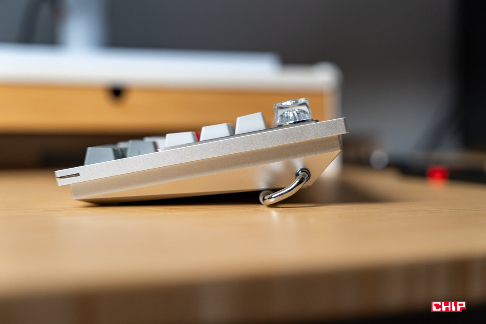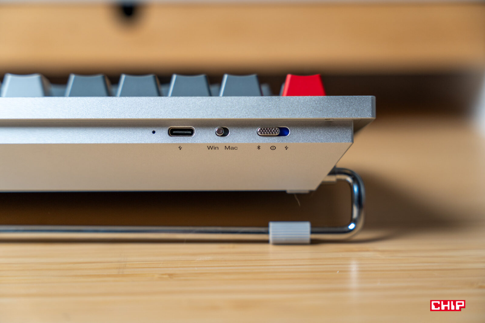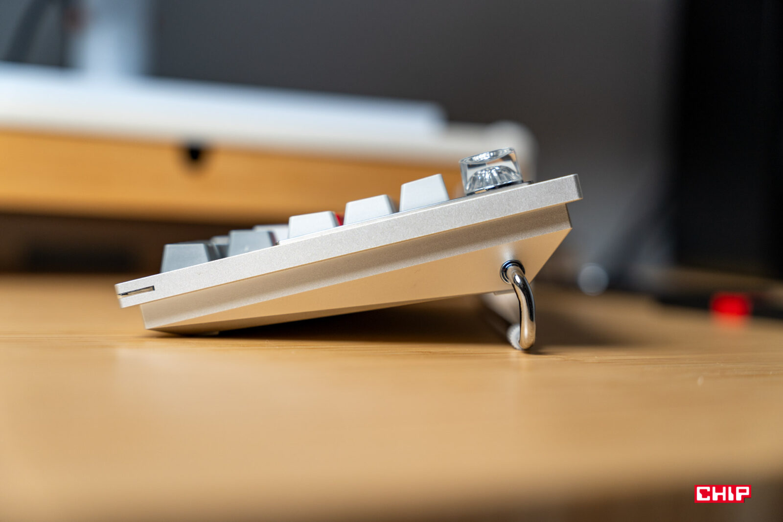 Kolejnym elementem wyróżniającym klawiaturę OnePlusa jest stopka w tylnej części obudowy. Pozwala ona na bardzo szeroki zakres regulacji kąta nachylenia klawiszy. Choć jakiego kąta byśmy nie wybrali, zdecydowanie rekomendowałbym użycie dodatkowej podpórki pod nadgarstki, bo nawet jeśli ustawimy klawiaturę możliwie płasko, jest ona na tyle wysoka, że nadgarstki będziemy mieć albo wygięte, albo w powietrzu. A tak być nie powinno.