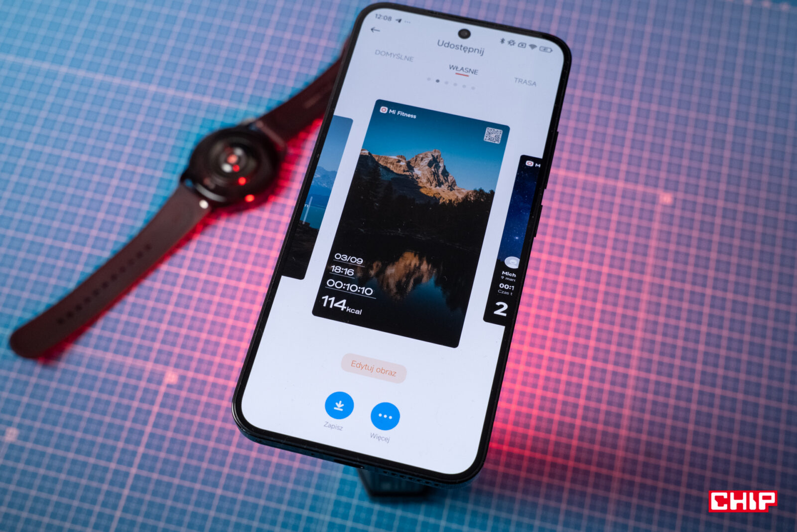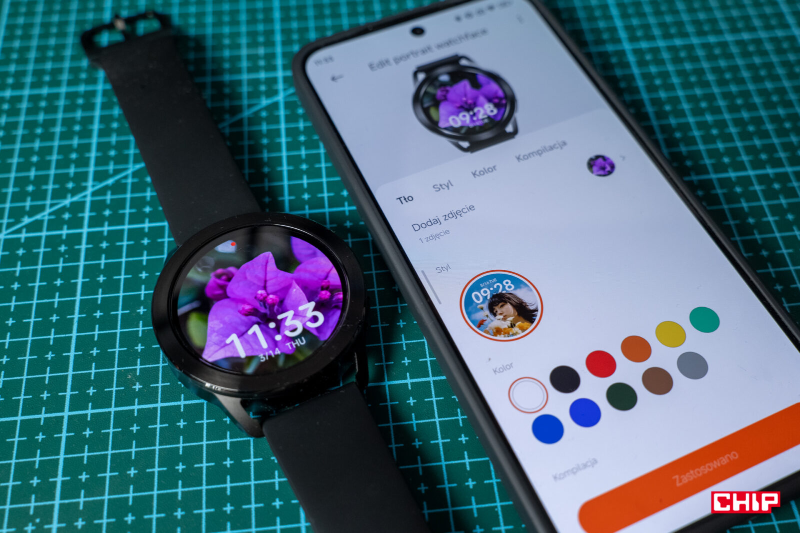 Co warto docenić, niektóre tarcze są edytowalne. Czasem sprowadza się to do jednej z kilku opcji kolorystycznych w sklepie, czasem pozwala na zmianę kroju zegara, ilości pokazywanych elementów oraz ich położenia. Istnieją także tarcze tworzone w oparciu o zdjęcia, które wcześniej musimy wgrać w aplikacji Mi Fitness. Nie mamy za dużego wyboru – tapetę zmieniamy przy wgraniu zdjęcia i nie wrócimy do tworzonych wcześniej kompozycji, ani w aplikacji, ani na zegarku.