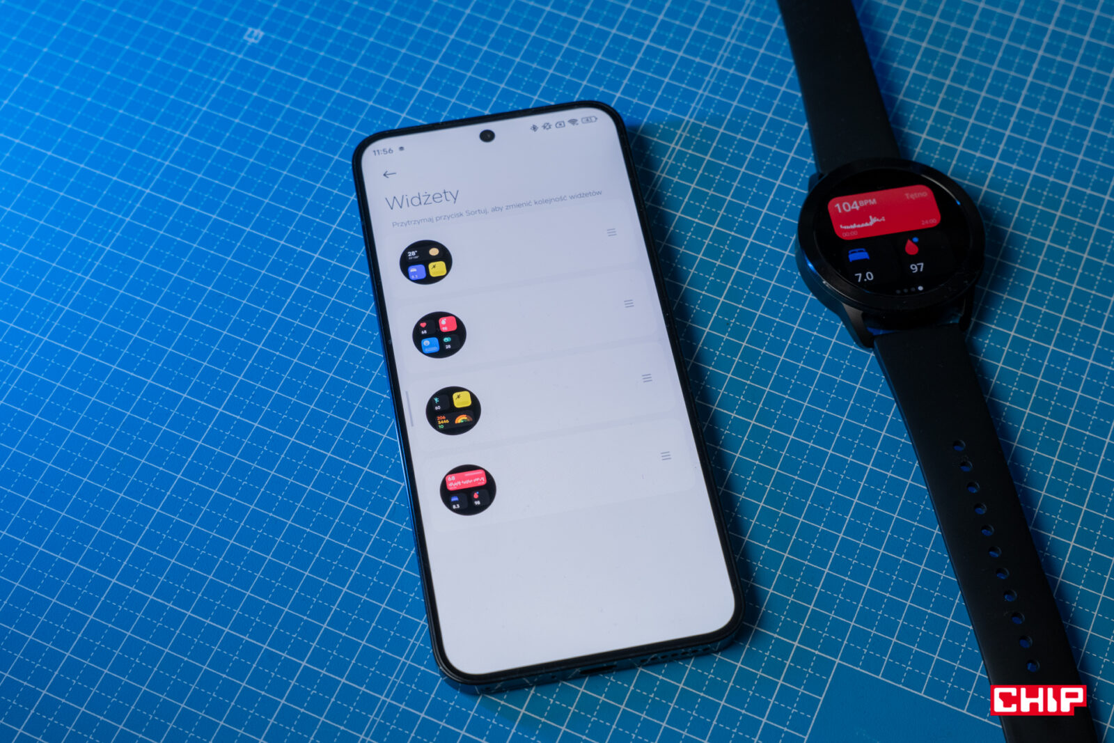Drugi sposób na szybszy dostęp do aplikacji to przypięcie ich widżetów na jeden z ekranów, do których dostęp uzyskamy przez przesuwanie w lewo i w prawo. Te wyświetlają informacje o pomiarach z naszego ciała, ale także pozwalają szybko uruchomić te, z których nie korzystamy stale. Oprócz tego pokazują pogodę czy jakość powietrza. Zakres widżetów, podobnie jak ich rozmiar i układ na ekranie, jest ograniczony – możemy zmieścić maksymalnie 4 widżety po 1 polu lub trzy widżety, gdzie jeden z nich ma wymiary 2×1. Przyjemne rozwiązanie, o ile lubicie przewijać palcem po ekranie smartwatcha.