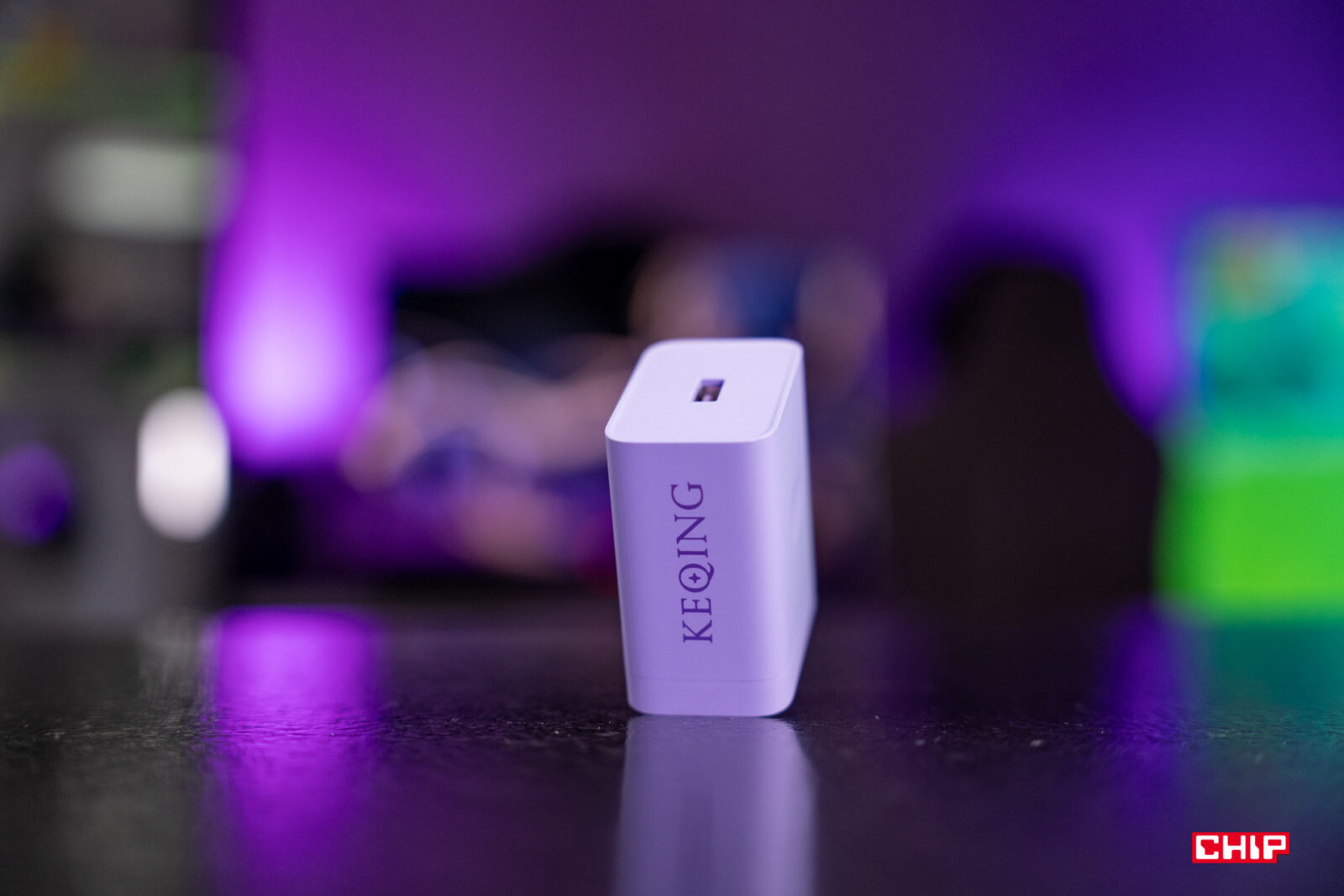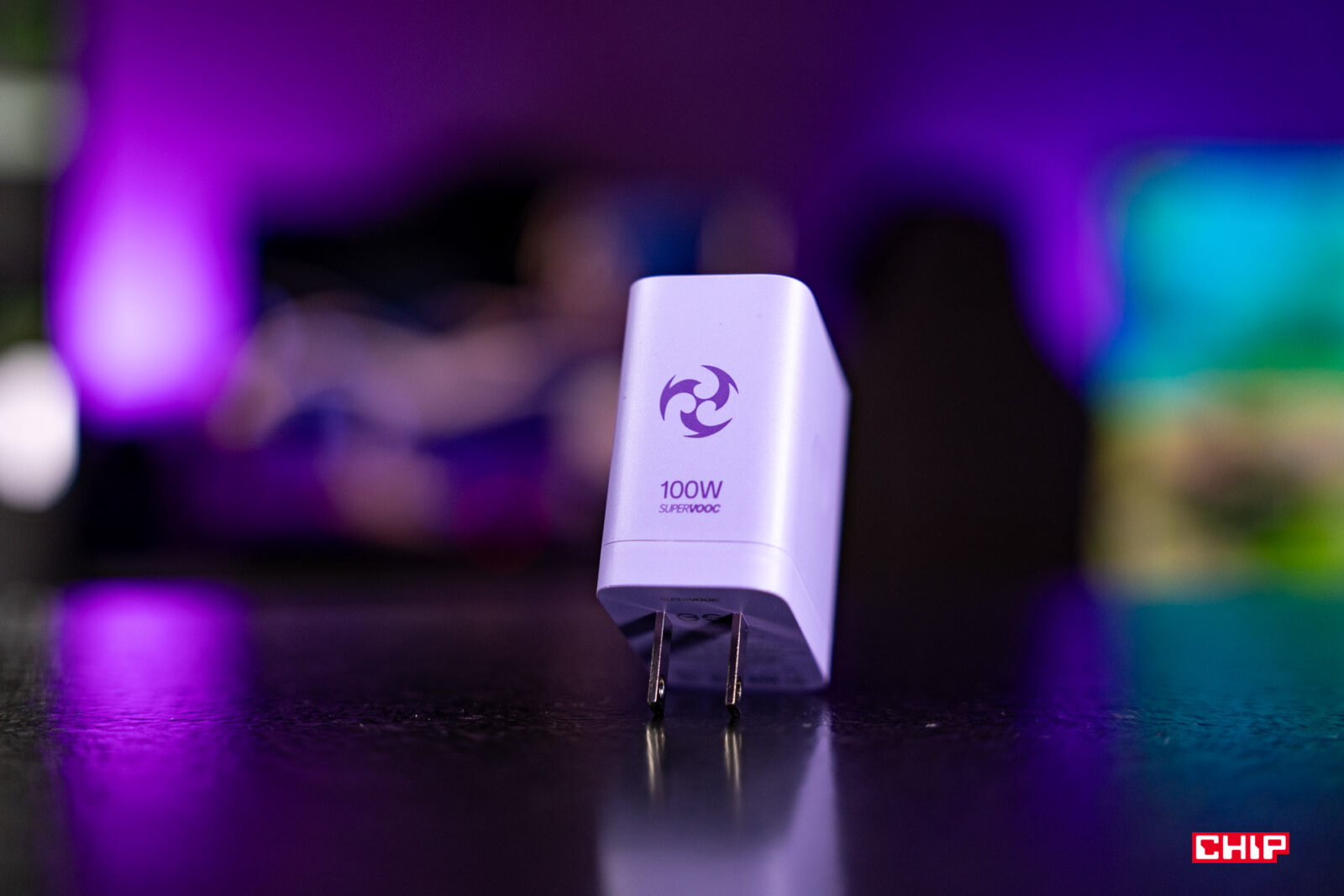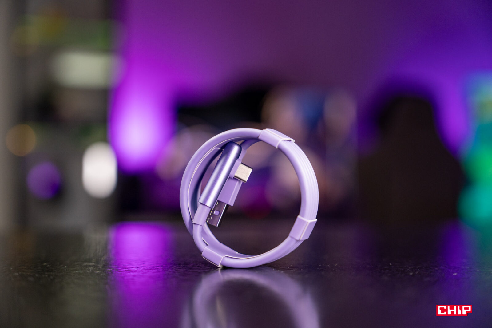 W smartfonowym zestawie nie mogło zabraknąć kabla USB-C oraz ładowarki. Nietypowo dla OnePlusa nie mają one czerwonych akcentów, za to są utrzymane w pasującym do reszty zestawu fiolecie. Dodatkowy plus za matową powierzchnię ładowarki.