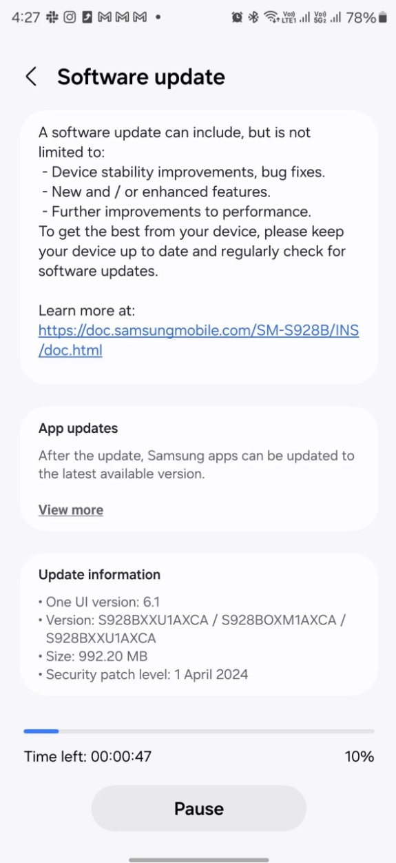 Aktualizacja oprogramowania dla Galaxy S24 w Korei waży 797,83 MB. W Indiach jest nieco cięższa – 999,2 MB, ale co do Europy nie mamy jeszcze pewności. Warto jednak zadbać o przynajmniej 1 GB wolnego miejsca. Zgodnie z informacjami, kwietniowa łatka przyniesie następujące ulepszenia i poprawki: