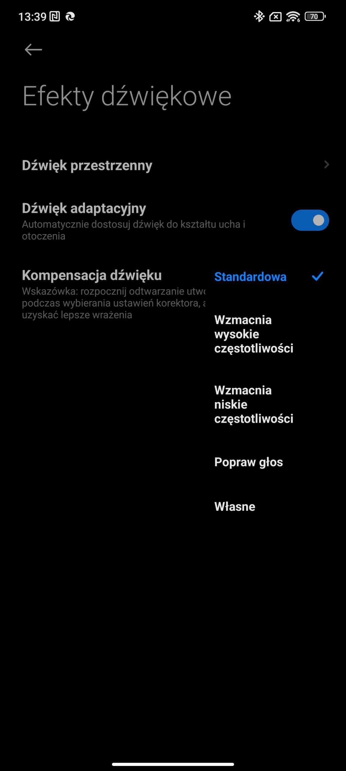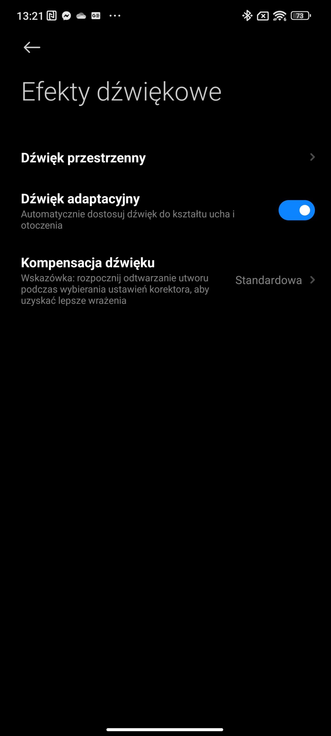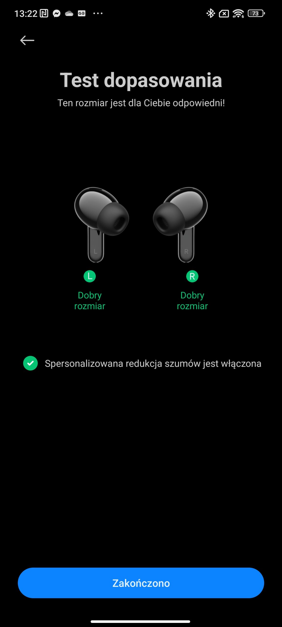 W Xiaomi Earbuds znajdziemy także możliwość włączenia trybu multipoint (domyślnie jest wyłączony) i wykonać test dopasowania – po jego przeprowadzeniu słuchawki zapamiętują profil naszego ucha i wtedy dostępna staje się spersonalizowana redukcja szumów w głównym panelu. W efektach dźwiękowych jest też możliwość włączenia dźwięku przestrzennego i adaptacyjnego (także dostosowuje odtwarzanie do kształtu kanału) i włączenia kompensacji dźwięku, czyli equalizera z trzema predefiniowanymi ustawieniami i jednym własnym, którego charakterystykę ustawiamy za pomocą 10 pasmowego regulatora.