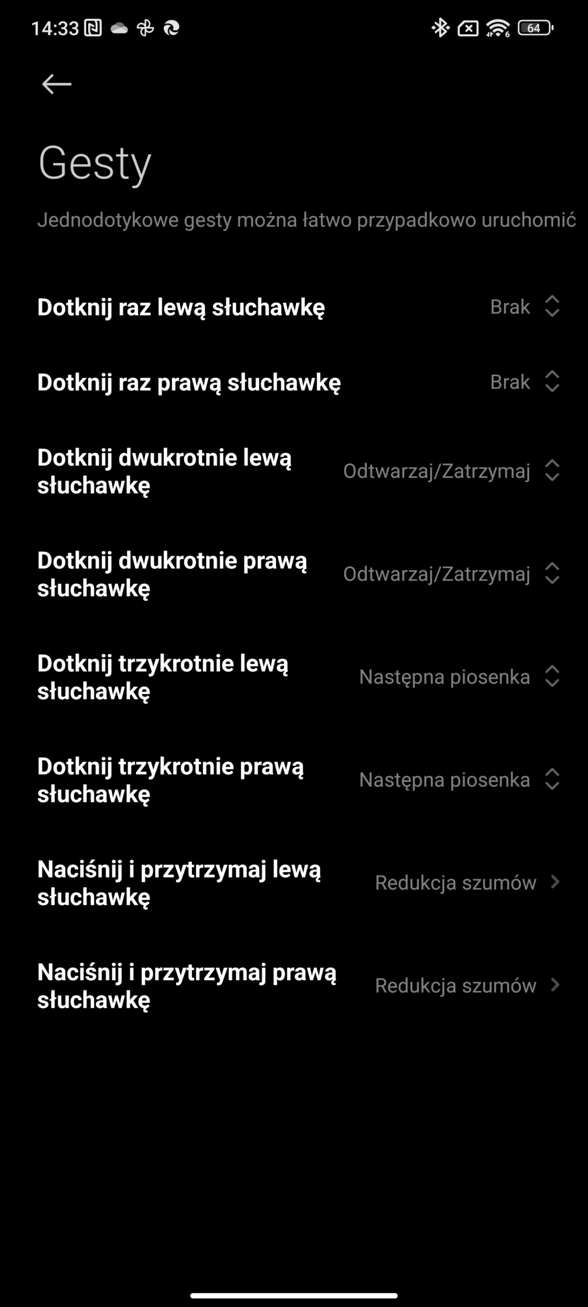 Do sterowania podstawowymi funkcjami słuchawek służą panele dotykowe. Zestaw działań można dość dowolnie konfigurować w aplikacji Xiaomi Earbuds – domyślnie używane są dotknięcia podwójne i potrójne (funkcje związane z odtwarzaniem) oraz dotknięcie i przytrzymanie (kontrola ANC). Pojedyncze dotknięcia nie mają przypisanych funkcji domyślnych i uważam to za znakomity pomysł – dzięki temu nie ma możliwości przypadkowego przeskoczenia utworu czy zatrzymania. Oczywiście nic nie stoi na przeszkodzie, by używać też pojedynczych dotknięć, jeśli ktoś lubi.