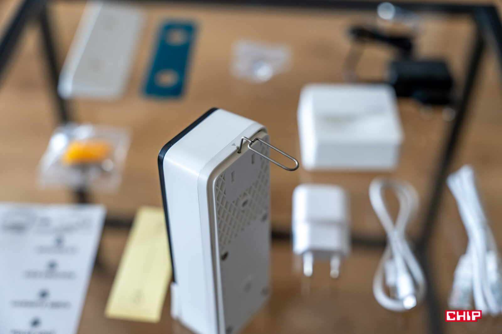 Drugi element to mostek. Malutkie pudełko na gumowych nóżkach, które możemy ustawić obok, na lub za routerem. Brakuje mi tu opcji powieszenia go na ścianie, ale jest na tyle lekki, że dwustronna taśma powinna załatwić sprawę.