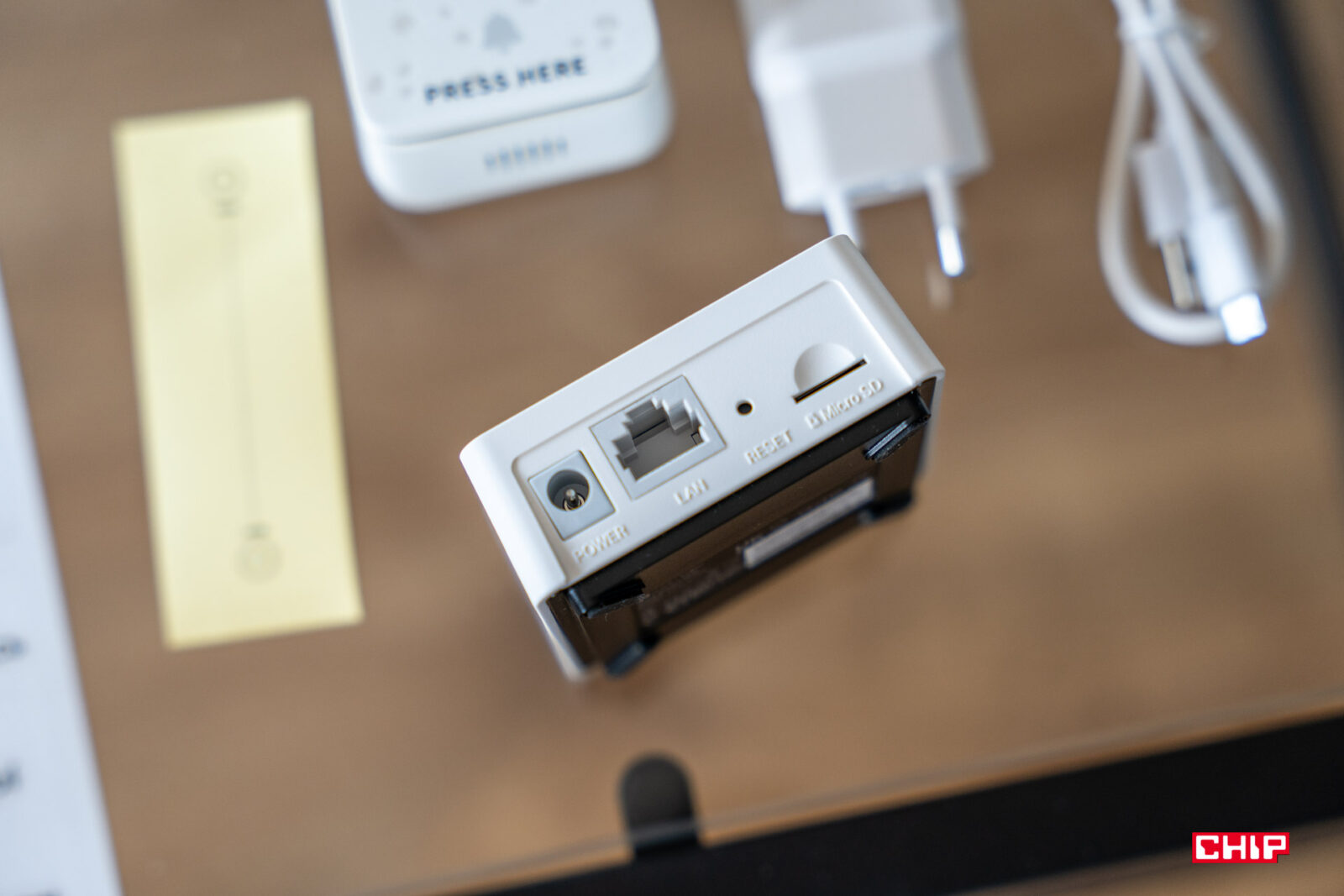 Poza dodatkowymi akcesoriami, przede wszystkim interesują nas dwa urządzenia. Dzwonek jest wysokości małego, 6-calowego smartfonu. Jest solidnie wykonany z dobrej jakości plastiku, a przycisk dzwonka pewnie się wciska i wydaje wyraźnie słyszalne kliknięcie. Dodatkowo w zestawie znajdziemy naklejki w różnych językach, więc Press Here możemy łatwo zmienić na Naciśnij Tutaj.