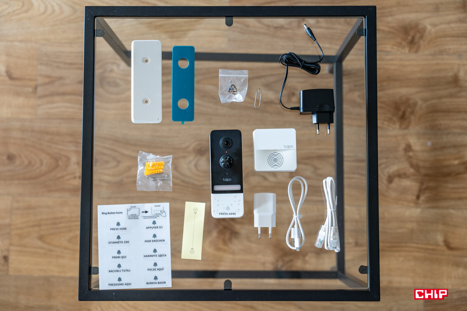 Niewielkie opakowanie dzwonka Tapo D230S1 kryje w sobie bardzo bogaty zestaw. Obok samego dzwonka znajdziemy w nim mostek odpowiadający za odtwarzanie dźwięków, akumulator, zestaw do montażu obejmujący dwustronną taśmę i wkręty z kołkami, komplet ładowarek i okablowania.