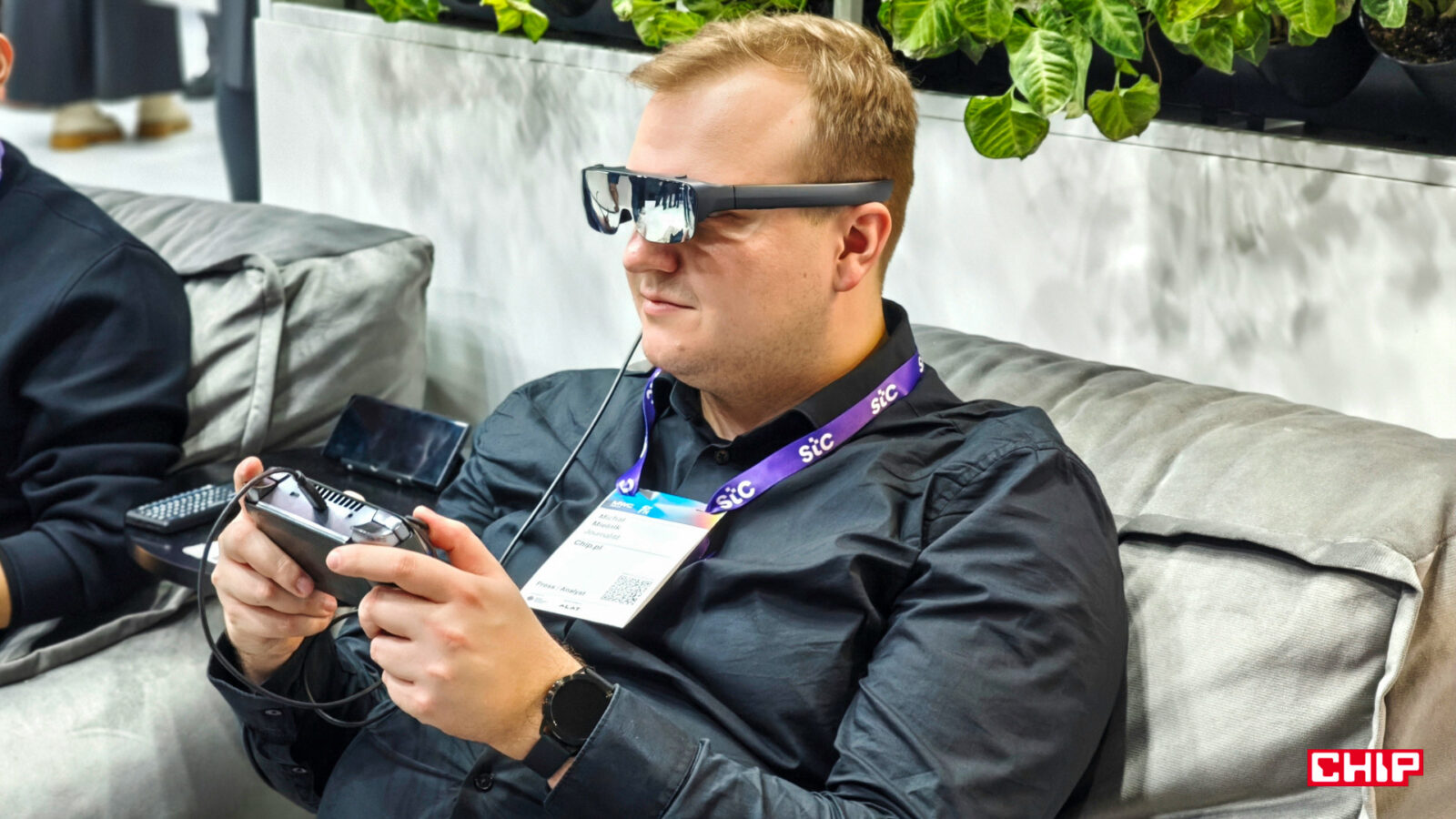 Port USB-C będzie szczególnie ważny. To dzięki niemu połączymy się z okularami, w których prezentowano ten zestaw. Te opierają się na dwóch ekranach Micro OLED o rozmiarze 0,71 cala każdy, choć dzięki systemowi soczewek efekt ma przypominać oglądanie 215-calowego ekranu z odległości 6 metrów. Sama technologia z pewnością imponuje tym, jak żywe są barwy oraz jak jasny może być ten ekran, ale nie jest to jeszcze rozwiązanie optymalne. Wąskie pole widzenia w połączeniu z dużą ilością sygnałów spoza okularów nie wyglądają dobrze, a do tego poza centrum ekranu pojawiają się znaczne zniekształcenia obrazu, Ten drugi problem pewnie rozwiązałoby lepsze dopasowanie soczewek. Same okulary są lekkie, wszak podają tylko obraz, więc jest przestrzeń, by popracować nad ich wyglądem.