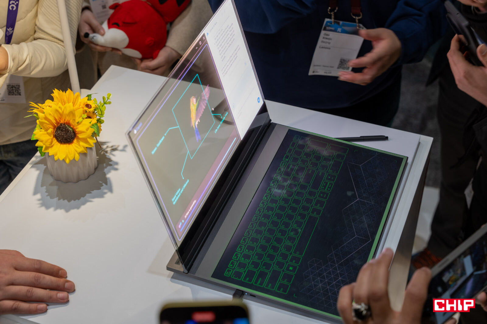 Nie chodzi mi nawet o koncept przezroczystego ekranu w laptopie od Lenovo, choć w tym przypadku muszę przyznać, że to wizja co najmniej ciekawa. 17,3-calowy ekran jest na tyle semitransparentny, by widzieć za nim nasze otoczenie. Zastosowany w nim panel microLED osiąga przezroczystość na poziomie 55%, ale w każdej chwili może przełączyć to ustawienie, by ukryć treści przed innymi. Idea odrysowywania treści z kartki na dotykowym ekranie czy dzielenia się treścią z dwóch stron jest ekscytująca, ale to produkt we wczesnej fazie rozwoju i na żywo można liczyć piksele na panelu. Do zestawu wrażeń dodano klawiaturę, która wyświetla się na tafli szkła.
