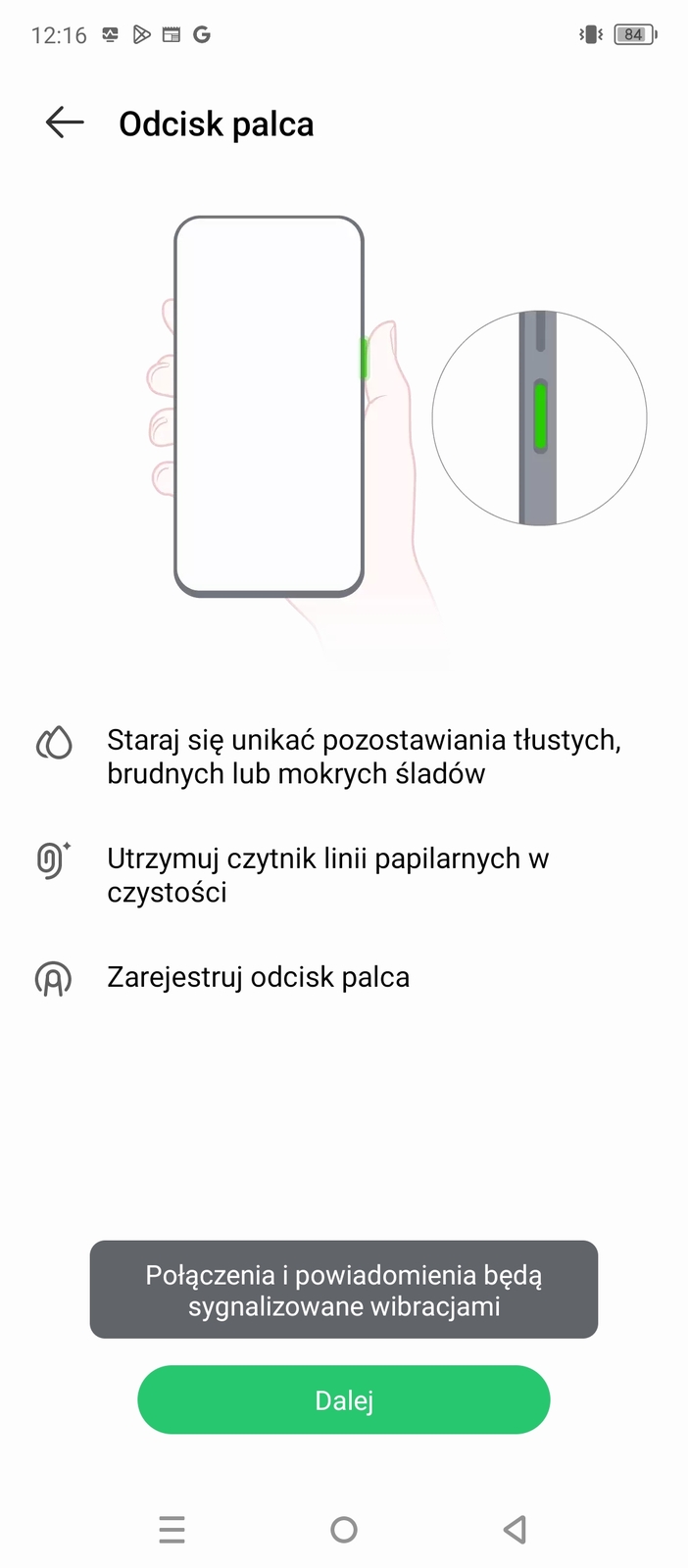 Z pozostałego wyposażenia należy wymienić Bluetooth 5.2, NFC, moduł GPS, wbudowany kompas oraz oczywiście port USB-C. Smartfon jest również pełnym dual-SIMem, także nie musimy wyjmować karty pamięci, w celu włożenia dwóch kart nanoSIM, co jest sporym plusem. Nie należy zapomnieć również o zabezpieczeniach – czytnik linii papilarnych został umieszczony po prawej stronie telefonu, w przycisku on/off. Jest on cały czas aktywny, ale nie zawsze odblokowanie odbywa się za pierwszym razem. Czasami musiałem przyłożyć palec do czytnika dwu, albo nawet trzykrotnie. Trochę sprawniej proces przebiega w przypadku odblokowania skanem twarzy, ale tylko wtedy, gdy mamy dobrze oświetloną twarz. Po zmroku była już różnie. Animacja towarzysząca odblokowaniu przy obiektywie aparatu, wzoruje się na Dynamic Island ze smartfonów Apple.