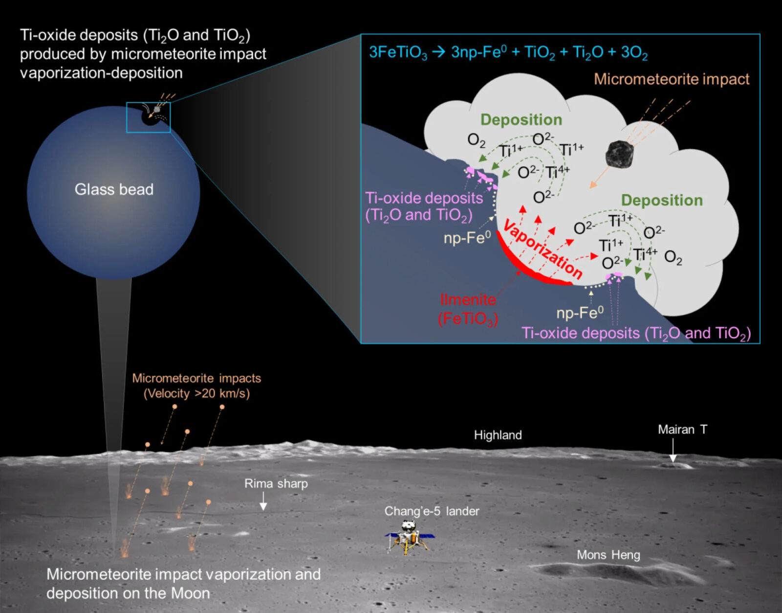 Powstaje zatem pytanie o to, dlaczego na Księżycu znajdujemy minerały, które na Ziemi nie występują. Według autorów opracowania przyczyna może leżeć m.in. w tym, że Księżyc nie ma atmosfery. Wszystkie mikrometeoryty, które uderzają w powierzchnię Ziemi, ze względu na brak atmosfery nie mają okazji wyhamować przed zderzeniem, więc z pełnym impetem uderzają w powierzchnię Księżyca (tak jak niektóre sondy kosmiczne). Energia wyzwolona w takim zderzeniu topi i odparowuje materię znajdującą się w miejscu uderzenia. Tak odparowana materia szybko jednak ulega ochłodzeniu i ponownie opada na powierzchni Księżyca. Właśnie w tym procesie kondensacji powstają owe nietypowe wersje dwutlenku tytanu, które zostały zidentyfikowane przez naukowców w próbkach z misji Chang’e-5.