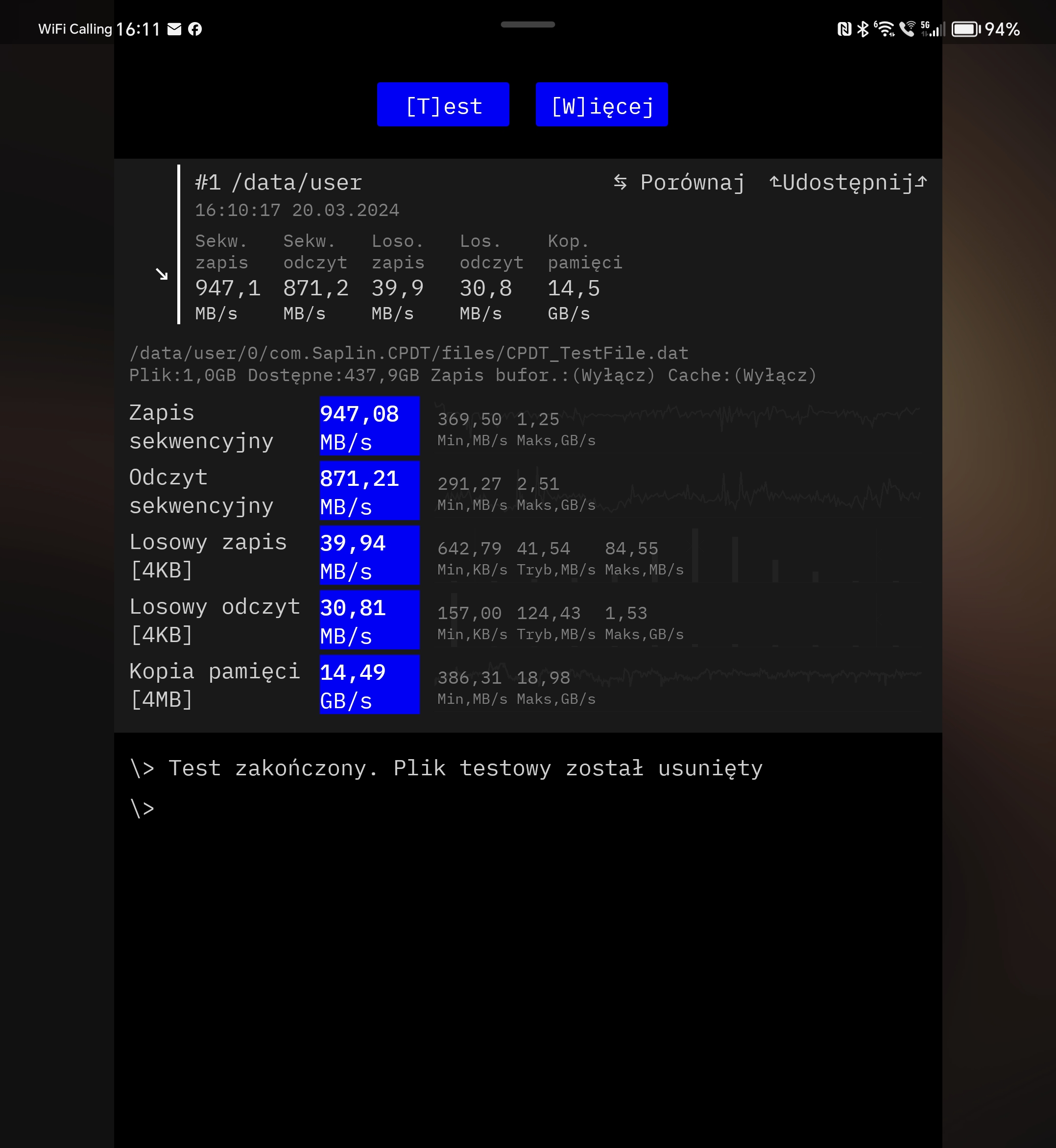 - szybkość ciągłego zapisu danych: 947,1 MB/s,