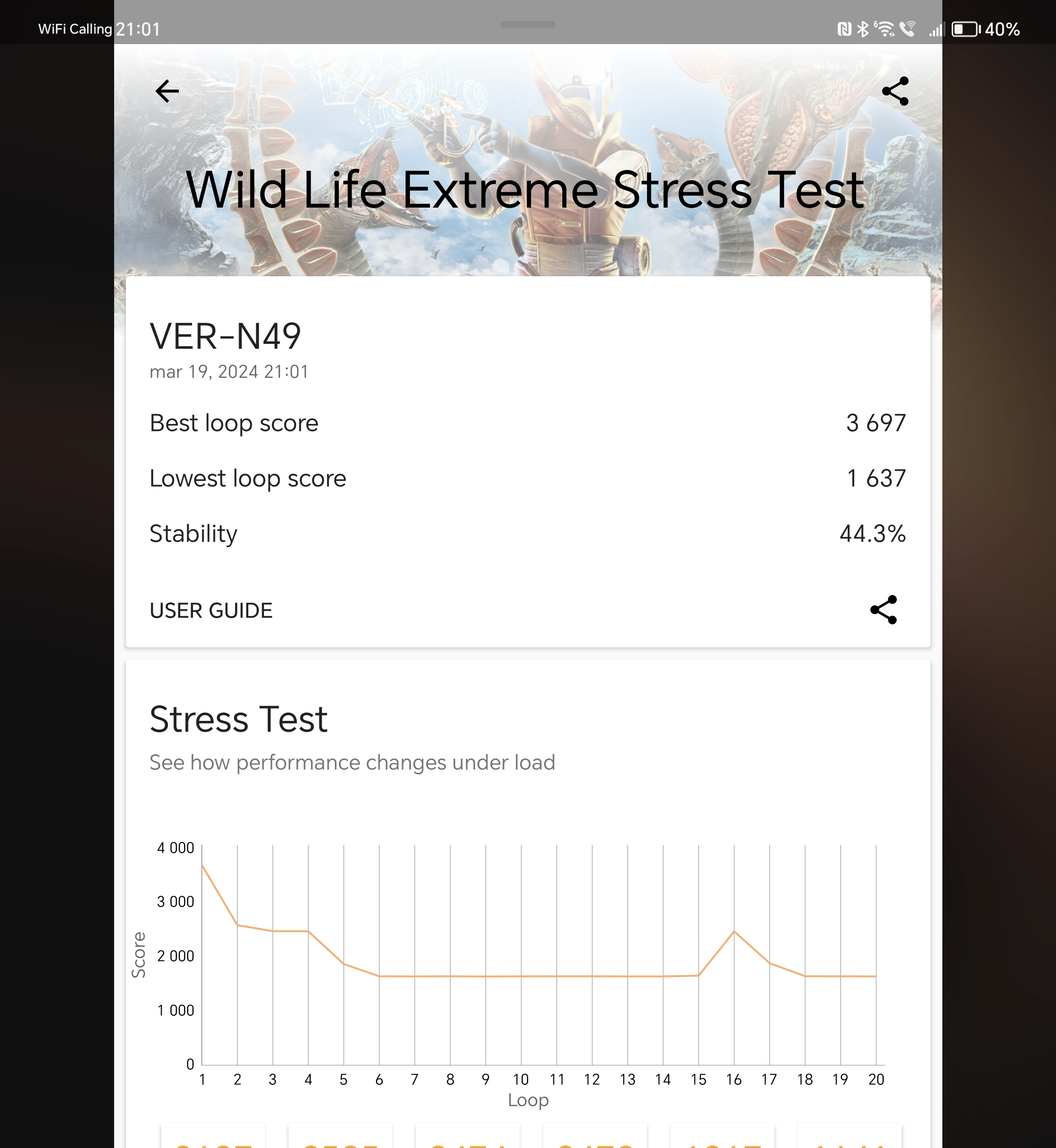 - Wild Life Extreme Stress Test: 3697/1637 pkt, stabilność 44,3%