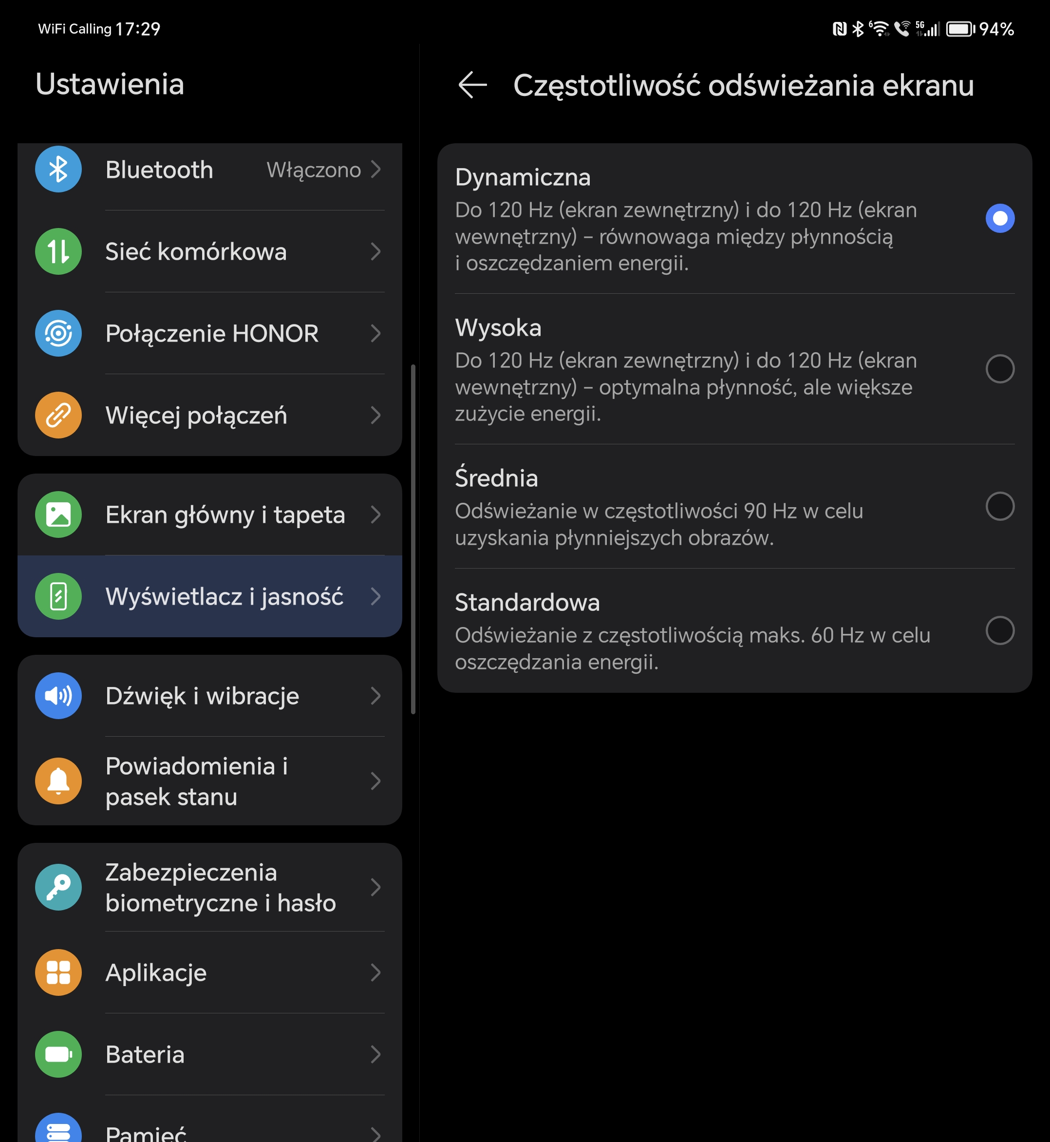 Rozłożony telefon cieszy oko dużym ekranem, w którym znalazła się klasyczna dziura dla przedniego aparatu – Honor nie silił się na ukrycie go za wyświetlaczem, więc aparat działa dobrze, a do otworu można się przyzwyczaić. W miejscu, w którym znajduje się zawias widać (zwłaszcza pod kątem) fałdę na wyświetlaczu, jednak w codziennej pracy raczej nie zwraca się na nią uwagi. Oba ekrany pokryte są folią ochronną, przy czym, jeśli chodzi o elastyczny, pod żadnym pozorem nie wolno jej zdejmować.