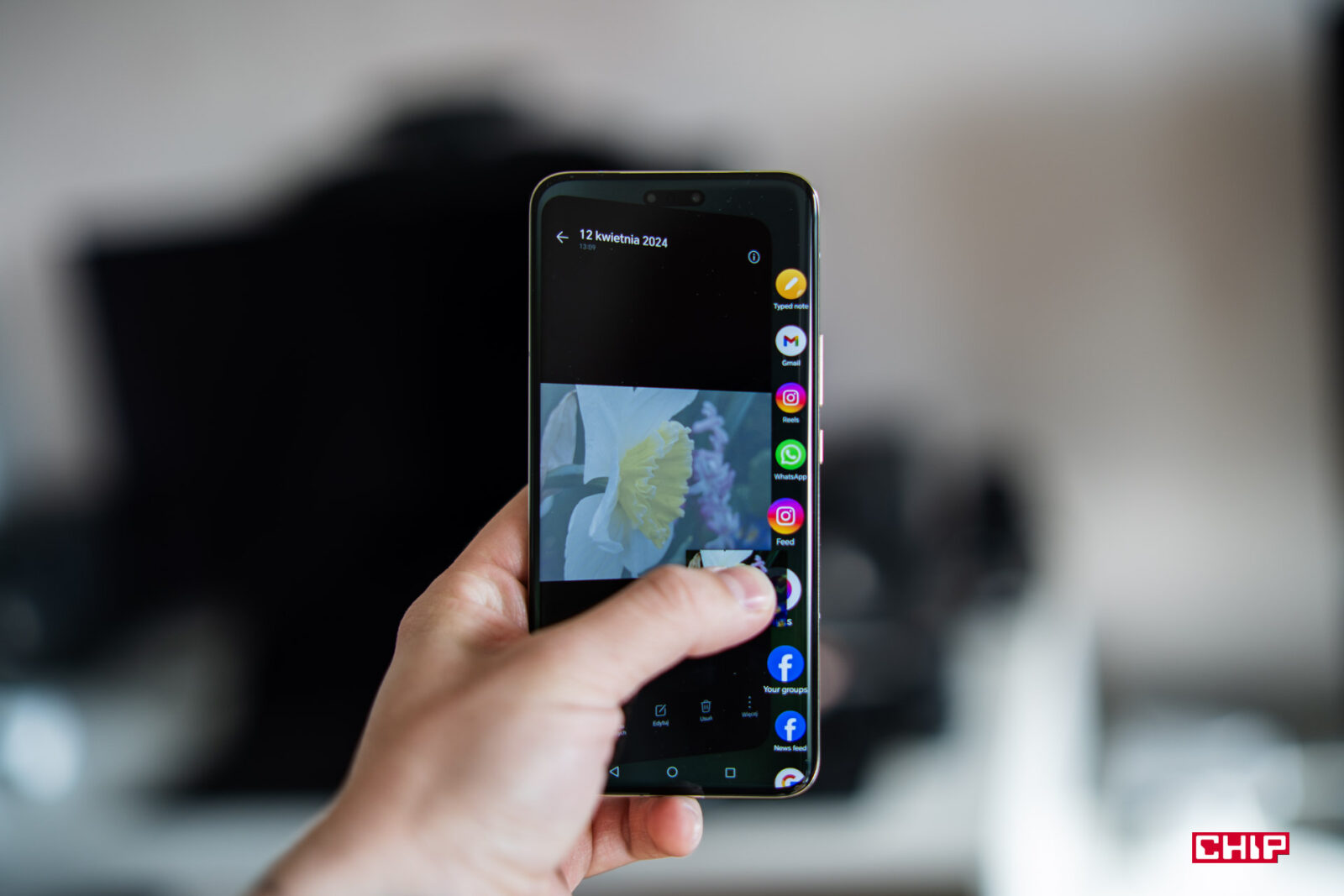 W Honorze Magic6 Pro nie muszę korzystać z kombinacji przycisków. Zrzut ekranu mogę zrobić intuicyjnym gestem zaciśnięcia pięści przed ekranem smartfonu, w odległości 20-40 cm. Funkcja działa wzorowo. Następnie przytrzymuję palcem zrzut ekranu i przeciągam obraz do prawej krawędzi wyświetlacza. To wywołuje belkę z aplikacjami, do których mogę przenieść mój zrzut. Lista aplikacji może zostać zaproponowana automatycznie, co generuje sztuczna inteligencja, albo możemy ręcznie przypisać najczęściej używane programy, jak Messenger, Facebook czy Notatnik. W ten sposób da się np. wstawić zdjęcie od razu do relacji na Facebooku czy Instagramie.