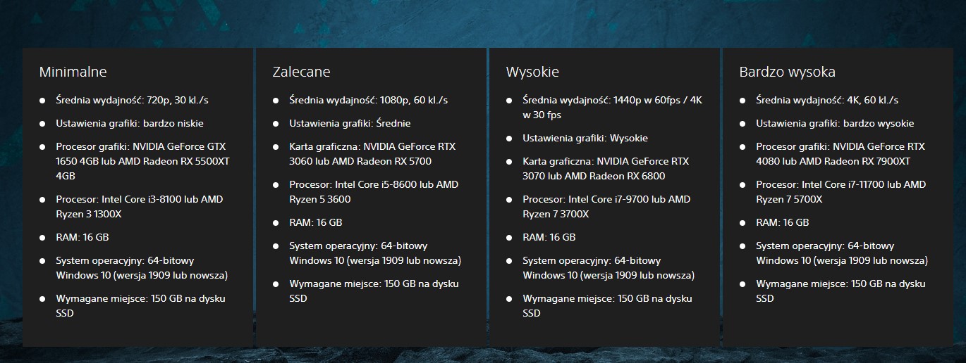 Minimalne wymagania obejmują kartę GTX 1650/ RX 5500 XT oraz procesor i3-8100 lub Ryzen 3 1300X. Należy jednak zauważyć, że dotyczy to grania przy ustawieniach bardzo niskich w 720p przy 30 fps, czyli nie jest to zbyt komfortowa rozgrywka. Zalecane ustawienia obejmują już RTX 3060/ RX 5700 oraz i5-8600 lub Ryzena 5 3600. Wymagania wysokie to już RTX 3070/ RX 6800 oraz procesor i7-9700/ Ryzen 7 3700X. Tutaj należy pamiętać, że jest mowa o ustawieniach wysokich i gamingu w 1440p przy 60 fps lub 2160p przy 30 fps. Jeśli chcecie grać w 3840 x 2160 przy ustawieniach bardzo wysokich i 60 fps to konieczna będzie karta RTX 4080 lub RX 7900 XT oraz procesor i7-11700 bądź Ryzen 7 5700X. Tutaj bez topowej grafiki się nie obejdzie, ale nie ma też zaskoczenia. Dla wszystkich ustawień wymagane jest 16 GB pamięci RAM oraz 150 GB miejsca na dysku.
