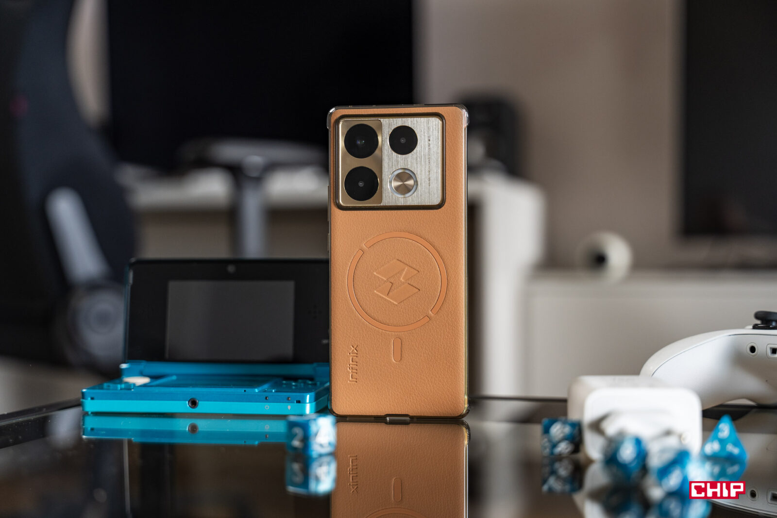 Infinix Note 40 Pro ma jeszcze jedną ciekawą funkcję związaną z ładowaniem i jest nią specjalne etui z technologią MagCharge. Nawet bez niej etui robi bardzo pozytywne wrażenie, bo jest cienkie i bardzo minimalnie zwiększa grubość smartfonu, a do tego ma skórzane wykończenie. To wygląda szalenie efektownie i elegancko. No ale my tu przecież o ładowaniu… Po założeniu etui, do jego tylnej części możemy za pomocą magnesów przyczepić specjalną ładowarkę, która ładuje akumulator z mocą 15 W, a maksymalna obsługiwana moc w przypadku ładowania bezprzewodowego to 20 W. Sama ładowarka jest cieniutka, elegancka i świetnie komponuje się ze skórzanym etui.