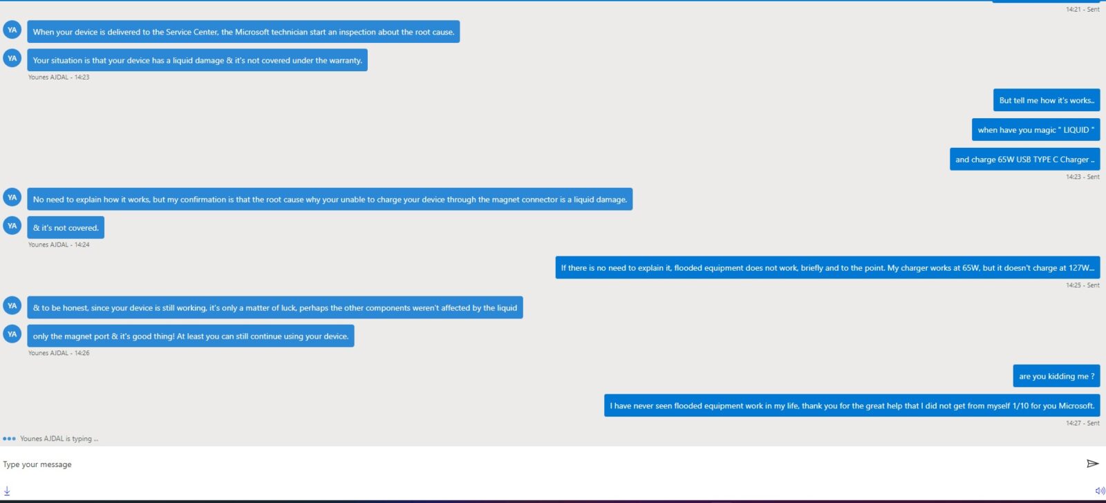 Tak też zrobił nasz Czytelnik i Surface Laptop Studio zaczął się prawidłowo ładować z maksymalną dostępną mocą. O czym postanowił poinformować Microsoft. Według giganta możemy w tym przypadku mówić o szczęściu, bo przecież zalany laptop nie ma prawa działać. A skoro już działa, no to przecież pomimo braku gwarancji można z niego dalej korzystać. No i po co te nerwy?