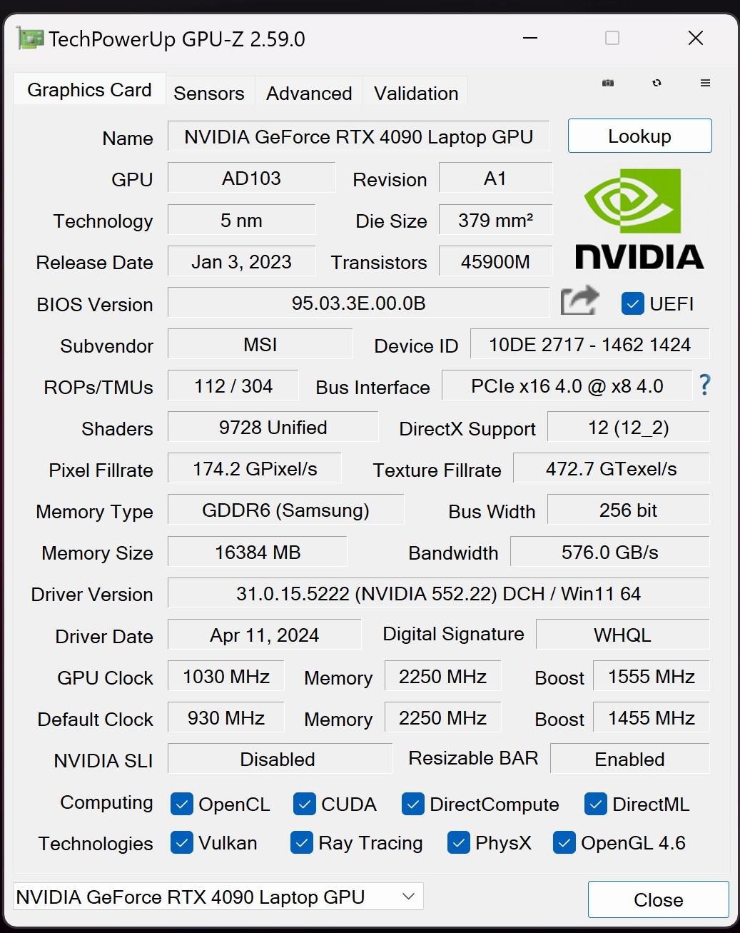 Karta graficzna to NVIDIA GeForce RTX 4090 o TGP równym 175 W. Grafika ma 16 GB VRAM i jest to najwydajniejsza karta, jaką możecie znaleźć w laptopach. Szkoda tylko, że w tym przypadku działa ona w trybie x8 zamiast x16 (zapewne dysk zamontowany został w złączu M.2 PCIe Gen5, w którym jeśli zamontujemy dysk to właśnie karta graficzna pracuje maksymalnie w trybie x8 – to samo jest w komputerach stacjonarnych z procesorami Intel). Trzeba tutaj też pamiętać, że w laptopie zastosowano technologię MSI OverBoost Ultra. Oferuje ona możliwość pracy przy maksymalnym poborze mocy przez kartę i procesor, albo możecie ustawić maksymalną wydajność dla wszystkich rdzeni P jeśli wykorzystujecie sam procesor. Łączna moc dla procesora i karty graficznej to 240 W.