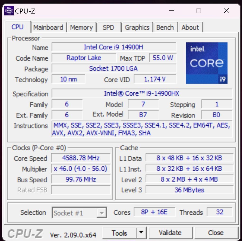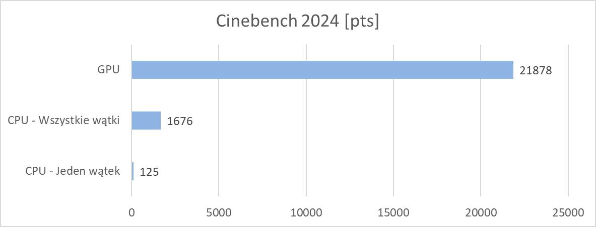 Zastosowany procesor to Intel Core i9-14900HX. Oferuje on 8 rdzeni P oraz 16 rdzeni E – razem 32 wątki. Maksymalna częstotliwość turbo rdzeni P to 5,8 GHz, a bazowa 2,2 GHz. W przypadku rdzeni E maksymalne taktowanie turbo to 4,1 GHz, a bazowe 1,6 GHz. Procesor ma 36 MB Intel Smart Cache. Warto też zwrócić uwagę na pobór mocy – MTP (maximum turbo power) wynosi 157 W, a PBP (processor base power) 55 W. CPU zostało posadzone na płycie z chipsetem Intel HM770. Współpracuje on też z 2x 16 GB pamięci DDR5 o taktowaniu 5600 MHz i opóźnieniach CL46. Te parametry nie są niestety najlepsze w szczególności przy porównaniu do tego, co oferują pamięci DDR5 w komputerach stacjonarnych.