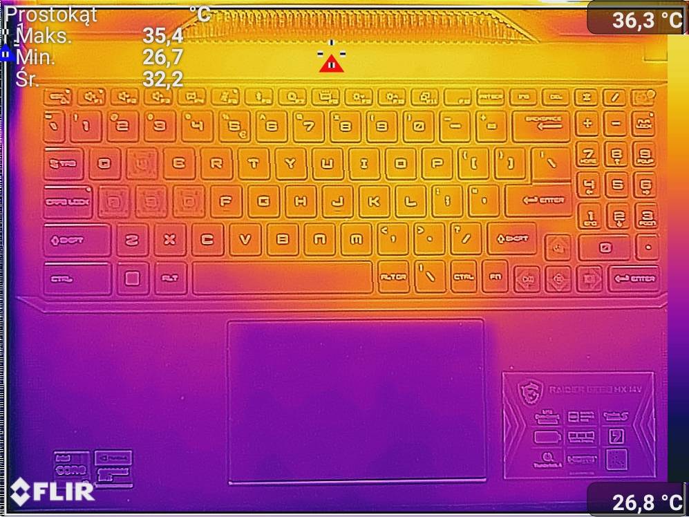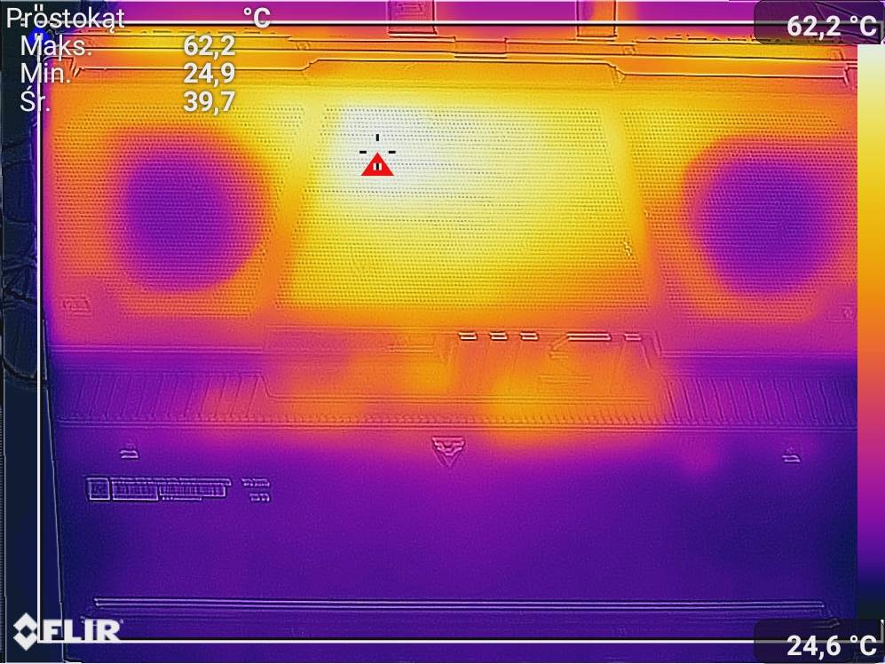 Obciążenie wykonałem poprzez odpalenie gry Cyberpunk 2077: Widmo wolności w rozdzielczości 3840 x 2400 przy ustawieniach ultra, bez RT czy PT. Tutaj temperatura procesora wahała się w granicach 92-103°C, a jego taktowanie w granicach 4-4,5 GHz. Karta graficzna notowała 84°C, a dysk 56°C. Jest więc naprawdę gorąco, co widać też na zdjęciach. Sama klawiatura nie była bardzo ciepła i to nie przeszkadzało w rozgrywce, ale laptopa na pewno nie kładźcie na kolanach. Głośność wynosiła ok. 57,7 dBA – jest naprawdę głośno i tutaj zdecydowanie polecam zakupić wyciszające słuchawki.